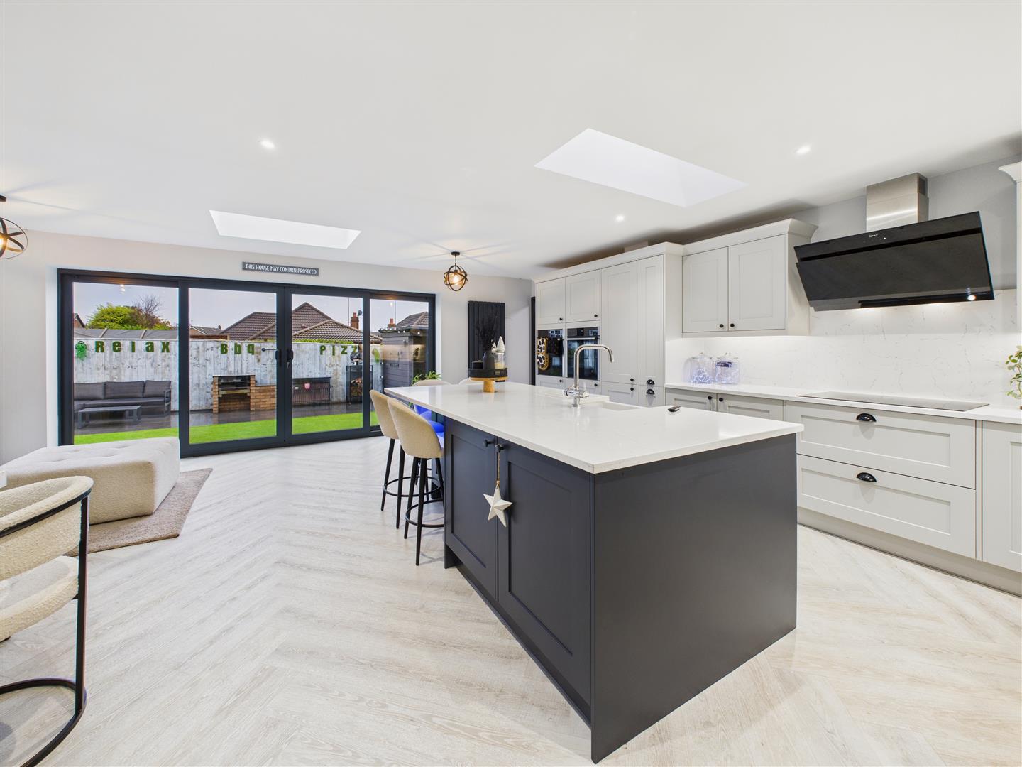 Having a range of contemporary dual tone base and wall units with granite worktops and large central island with breakfast bar peninsular. There is a belfast sink with boiling water tap, two Neff "hid and slide" ovens, induction hob with filter hood above, two fridge/freezers and a dishwasher.