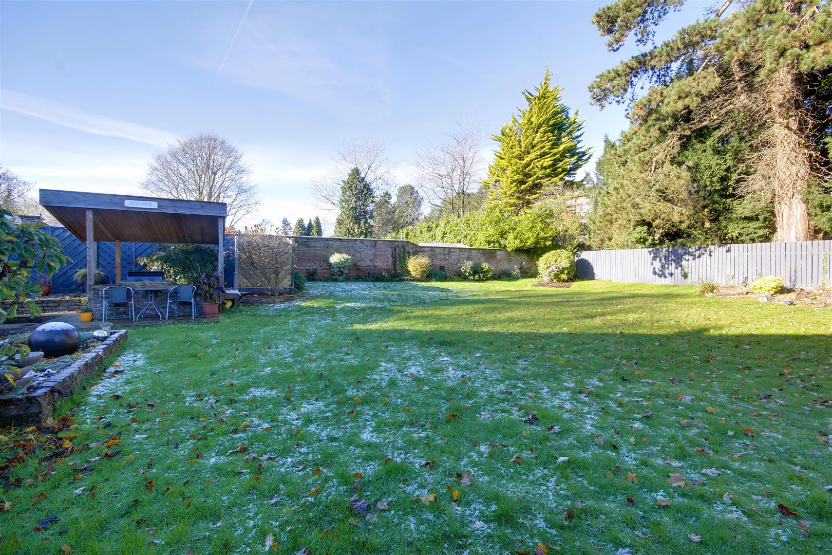 Outside, the home is set well back from the road behind mature hedging, ensuring a high degree of privacy. A generous block paved parking forecourt leads to a detached double garage, providing ample space for vehicles with attractive lawn and slate borders to the corners. The rear garden is a private oasis, primarily laid to a large lawn with multiple patio areas, perfect for outdoor dining and relaxation, all framed by secure walled and fenced boundaries. There is also a covered BBQ area.