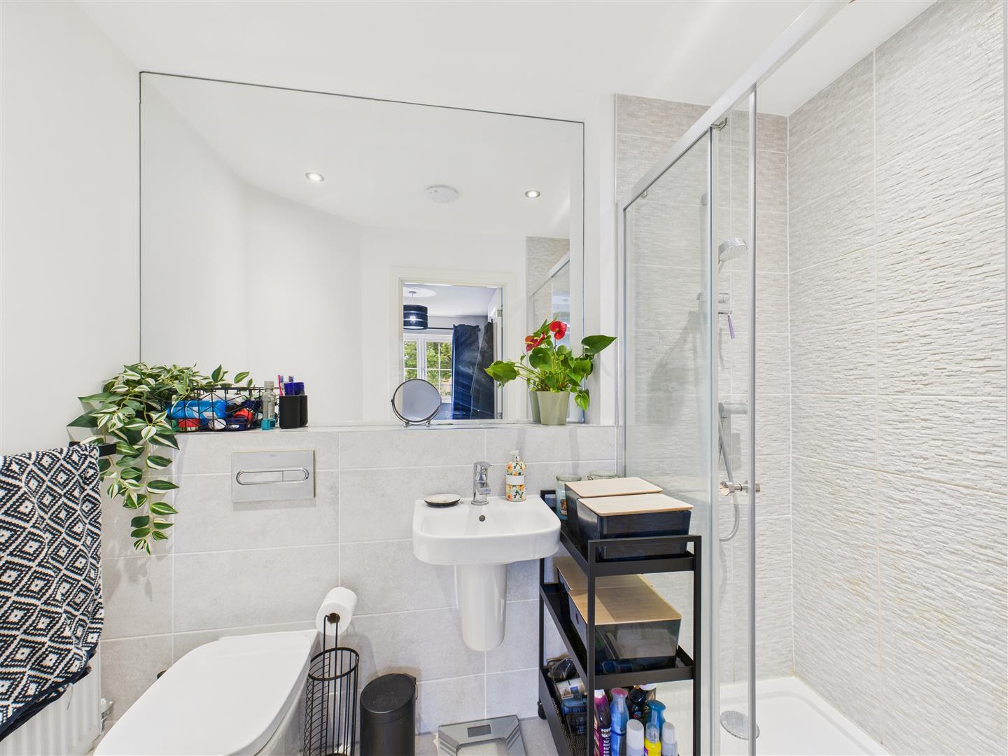 With suite comprising a bath with shower over and screen, wash hand basin and low flush W.C. Tiled surround and tiled floor. Window to rear.