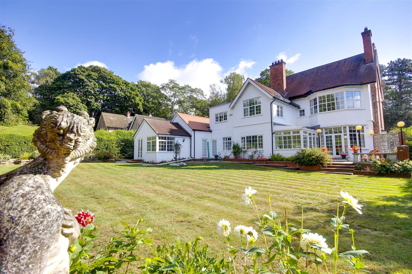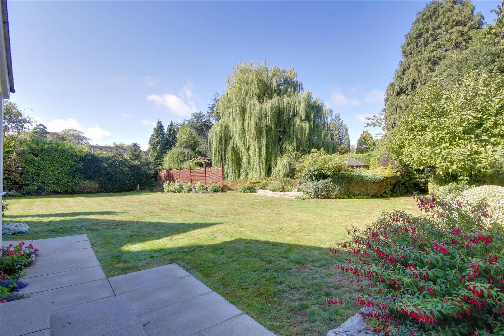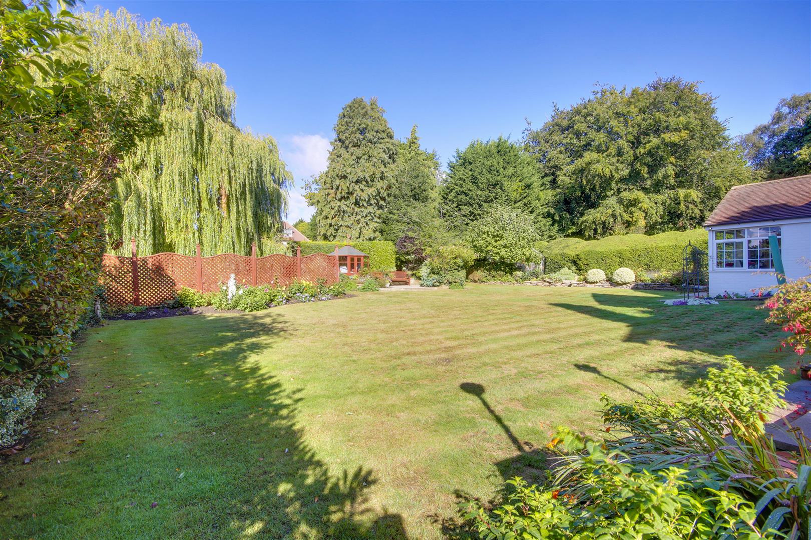 Wrought iron gates flank the entrance to the property which open to a wide gravel parking forecourt which can accommodate several vehicles. The property is well screened from the road with mature hedge and shrubbery. The lawn wraps around the front of the house and extends to one side. Directly to the rear of the house lies a paved terrace, ideal for relaxing or entertaining. An extensive lawn is bounded by mature hedges providing much seclusion and plenty of flora and shrubbery to provide areas of interest. A further rear patio is home to a summer house which looks back at the house, together with an area ideal as a vegetable plot.