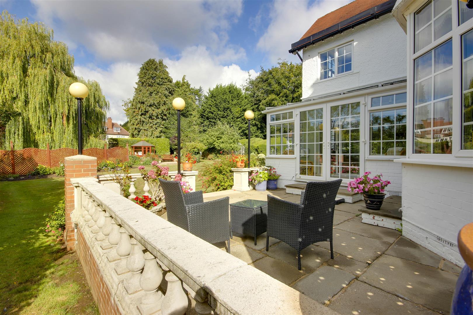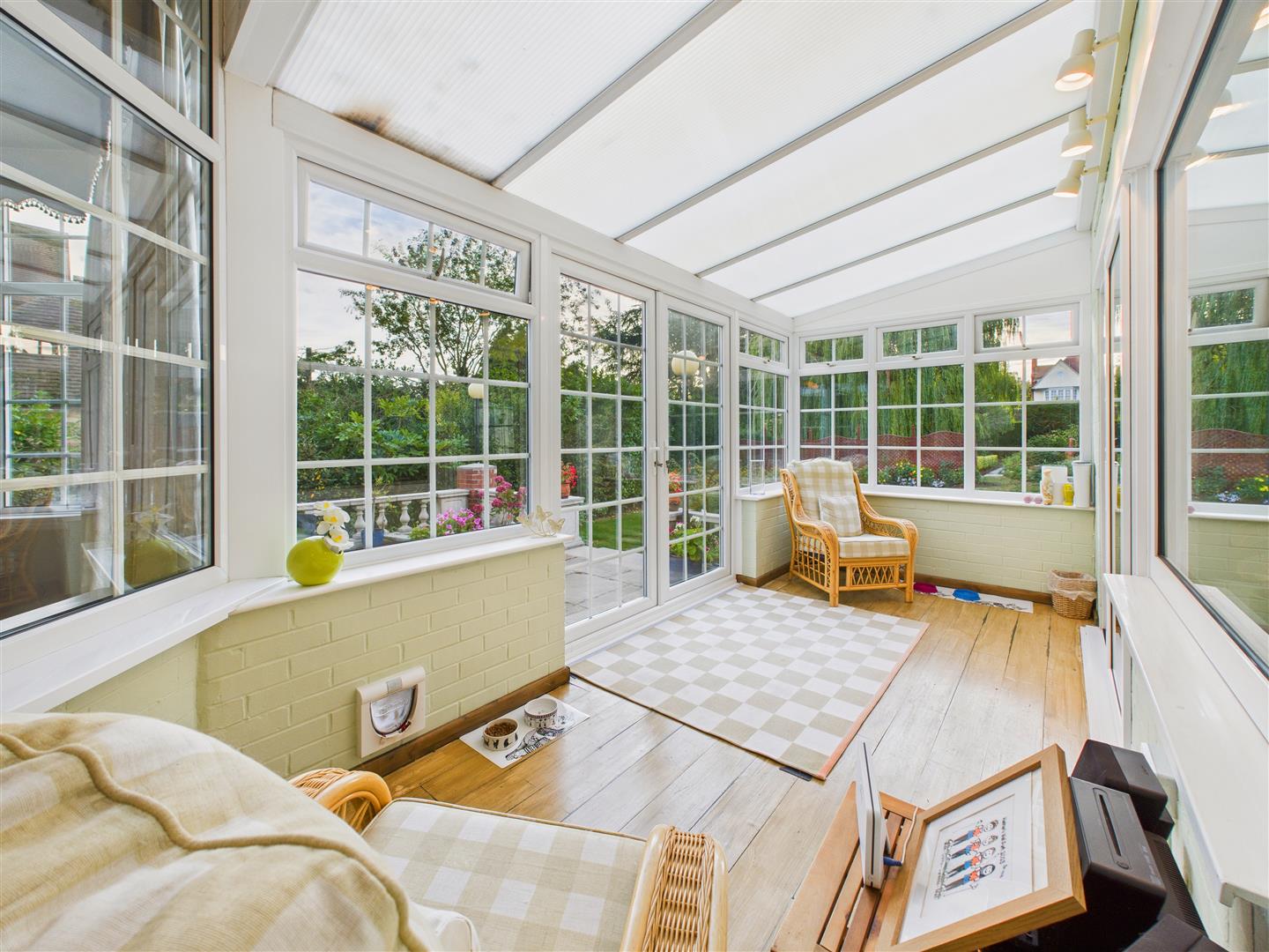 A beautiful room providing a panoramic view across the garden with windows and double doors leading out.