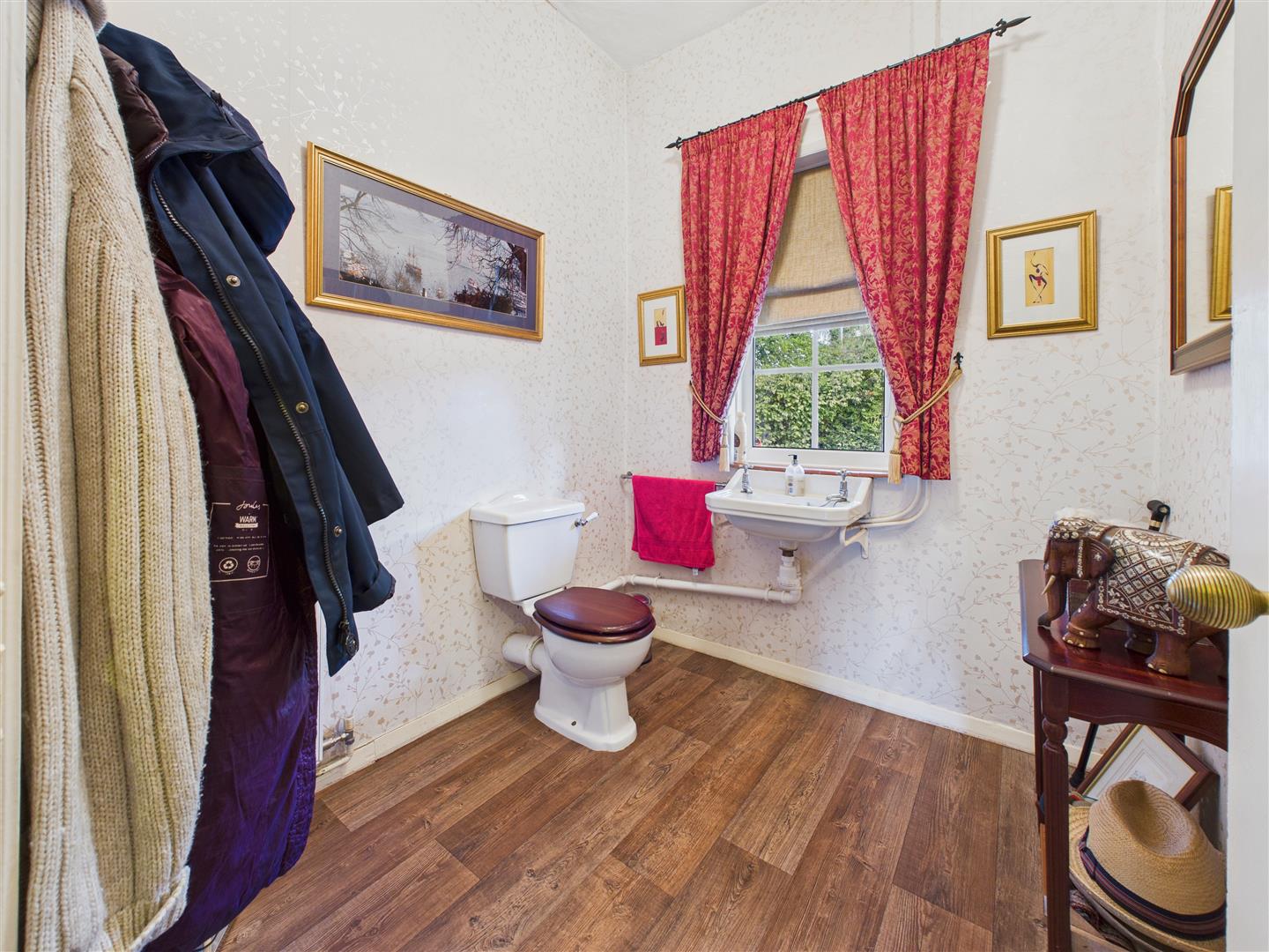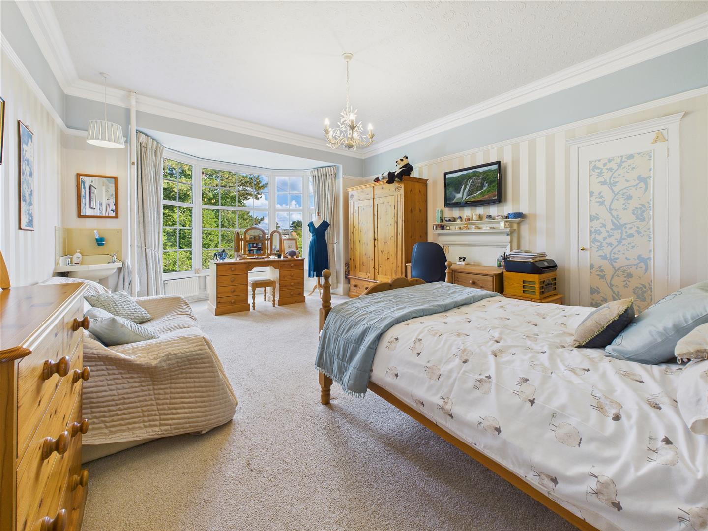 With deep walk-in bay window to front elevation, period fire surround, cupboard to alcove, vanity wash hand basin to one corner.