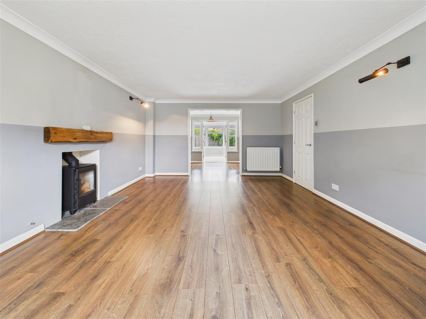 Bay window to front with fitted plantation style blinds. A log burner lies at the centre, with a stone hearth and oak mantle. An opening leads through to the dining area.