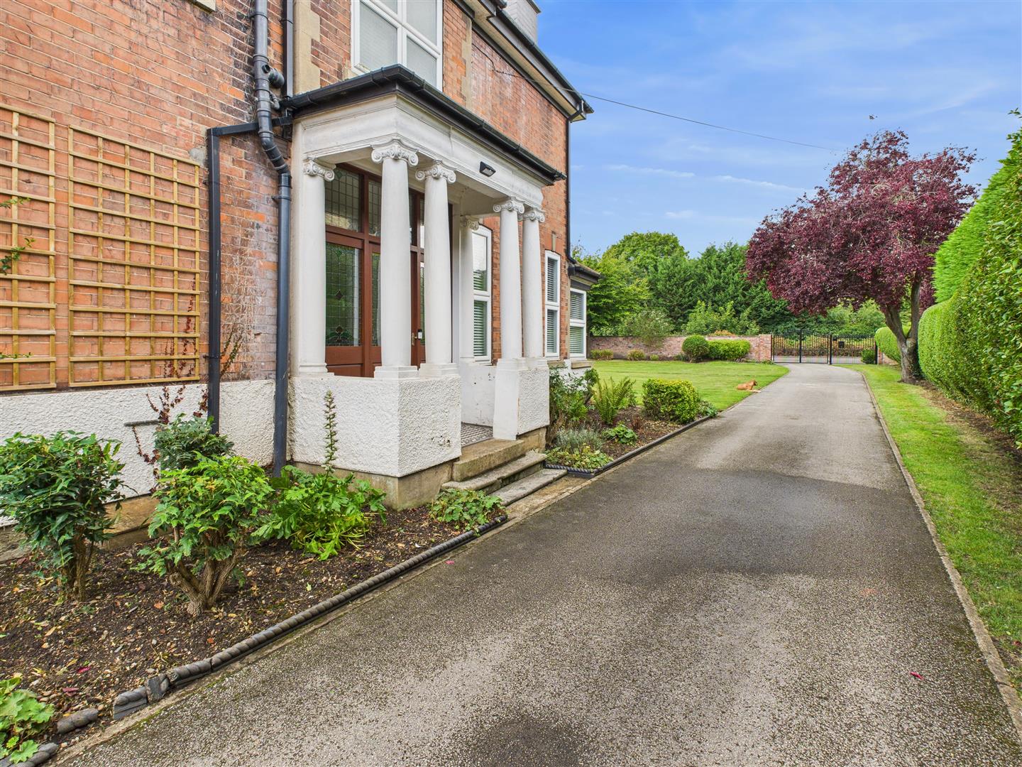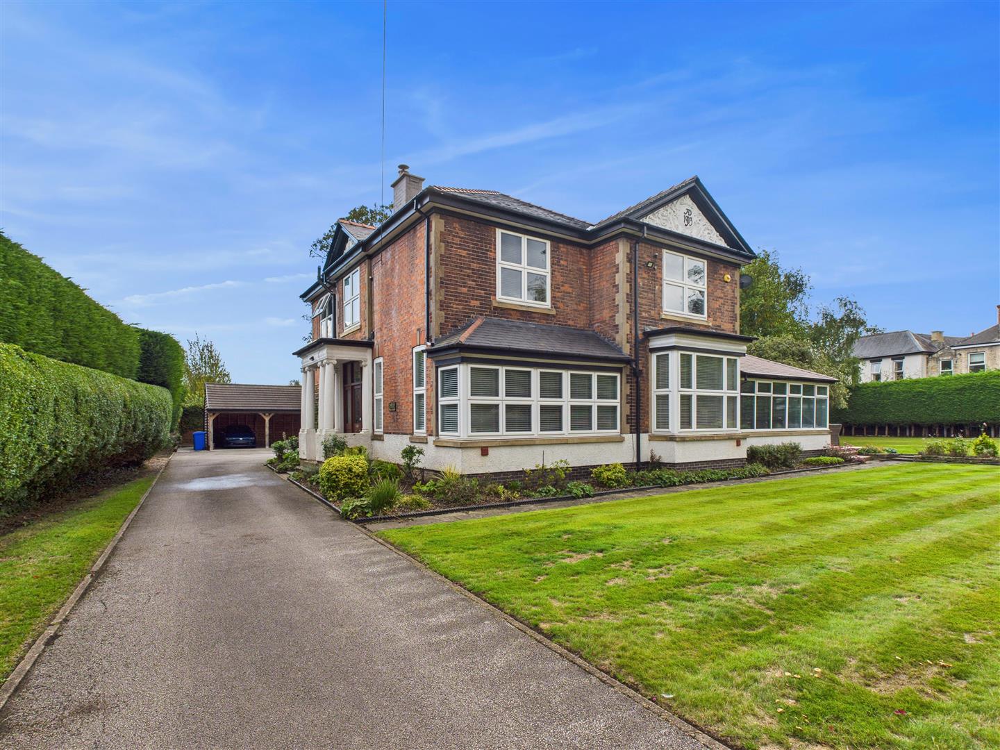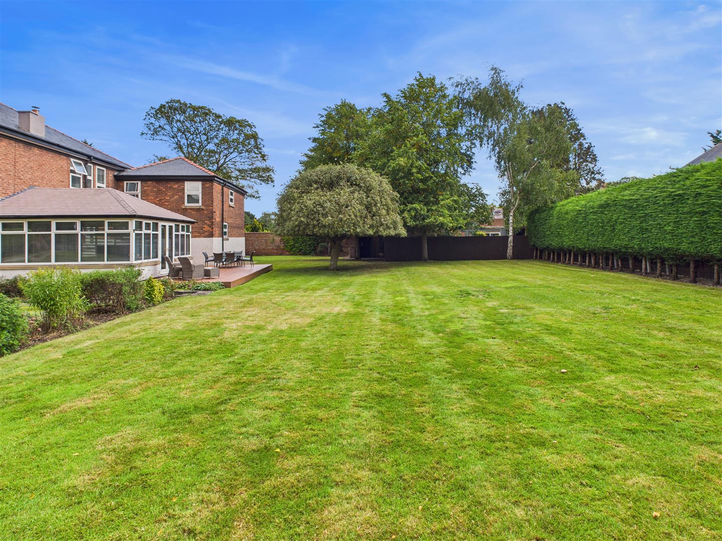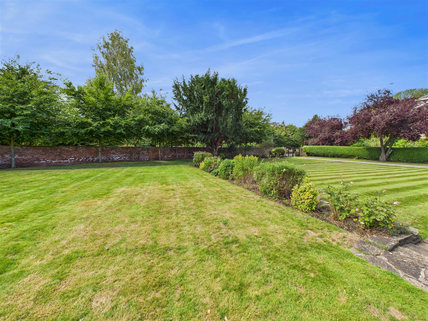 Double wrought iron gated open to the property with a long driveway leading up to the front of the house and onwards to the parking courtyard. Extensive lawns lie to the front, one side of the house and rear. There is also an extensive patio area which enjoys a sunny southerly facing aspect. To the rear opens up a parking forecourt with plenty of turning space, excellent parking and access to the triple open barn style garaging. To the rear boundary lies a high brick wall with the Botanic Gardens beyond. Tucked away to one corner of the garden is a garden shed/workshop.