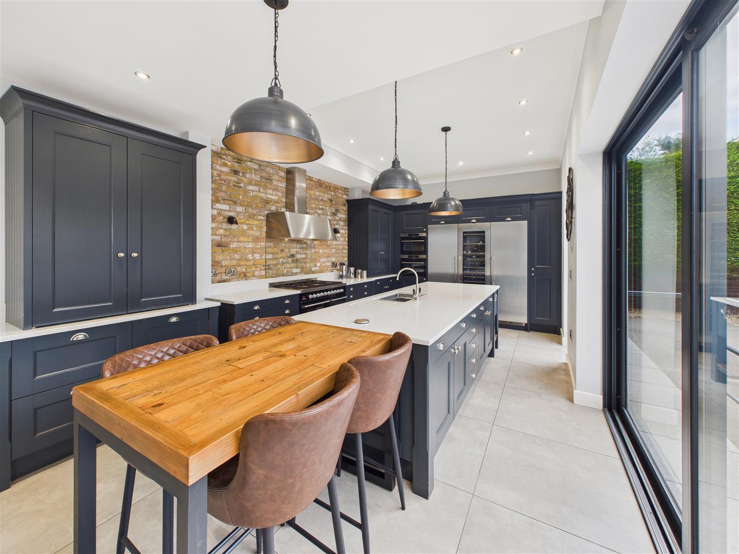 An amazing contemporary living kitchen, situated to the rear of the house with a sliding door system leading out to the terrace.  The kitchen features an array of beautiful hand made units and matching island both with quartz tops.  Features include an AEG oven and combination microwave oven, range cooker with extractor hood above, dishwasher, Cople combination fridge/freezer and drinks chiller, one and half undercounter sink with mixer tap and a series of three pendant lights above the island.  Beautiful tiled floor through, recessed downlighters to ceiling.