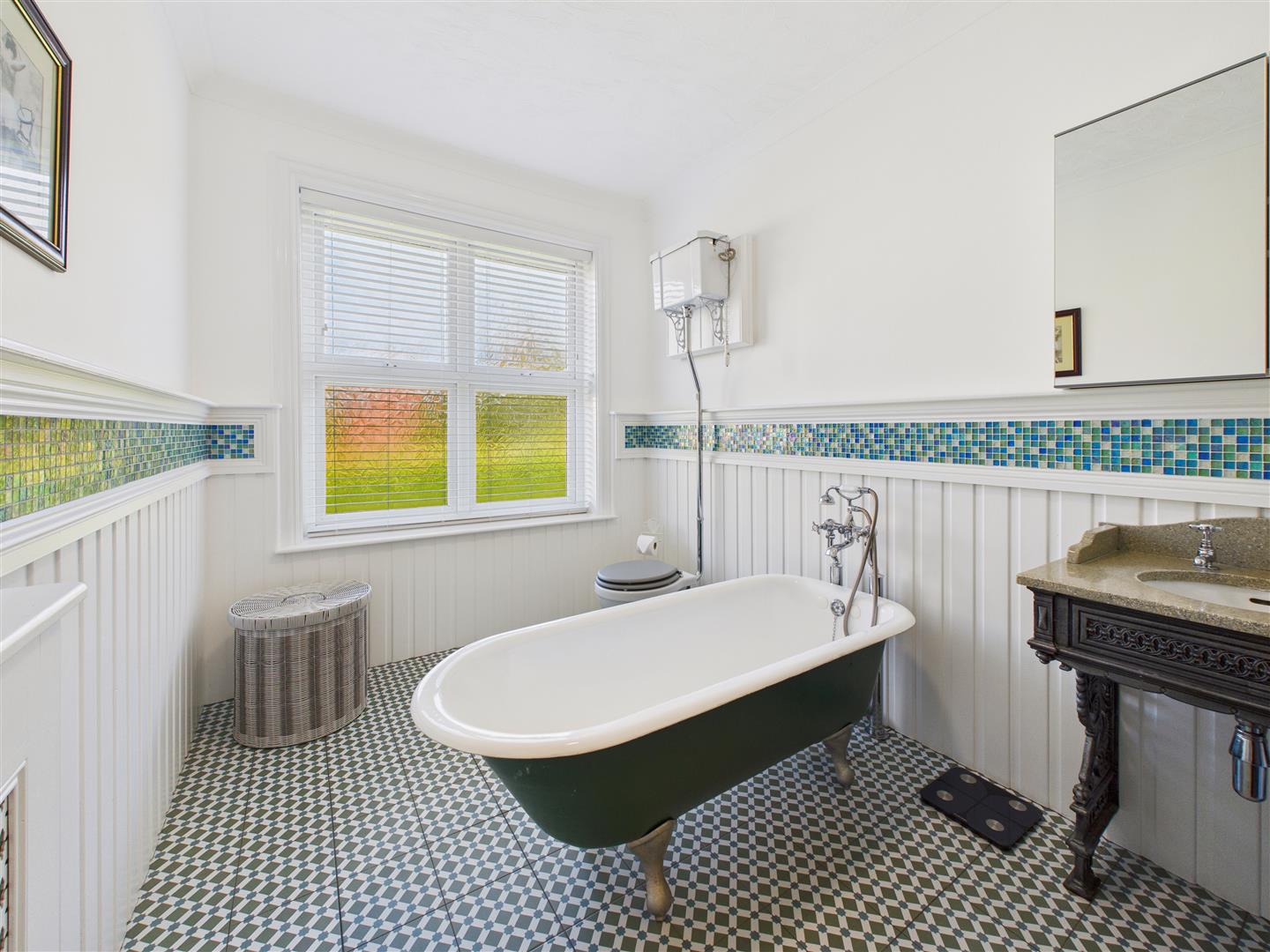 A period suit comprising low level WC, claw footed free standing bath, separate shower area with handheld and rain head shower, wash hand basin within cabinet. Tiling to the walls and floor.