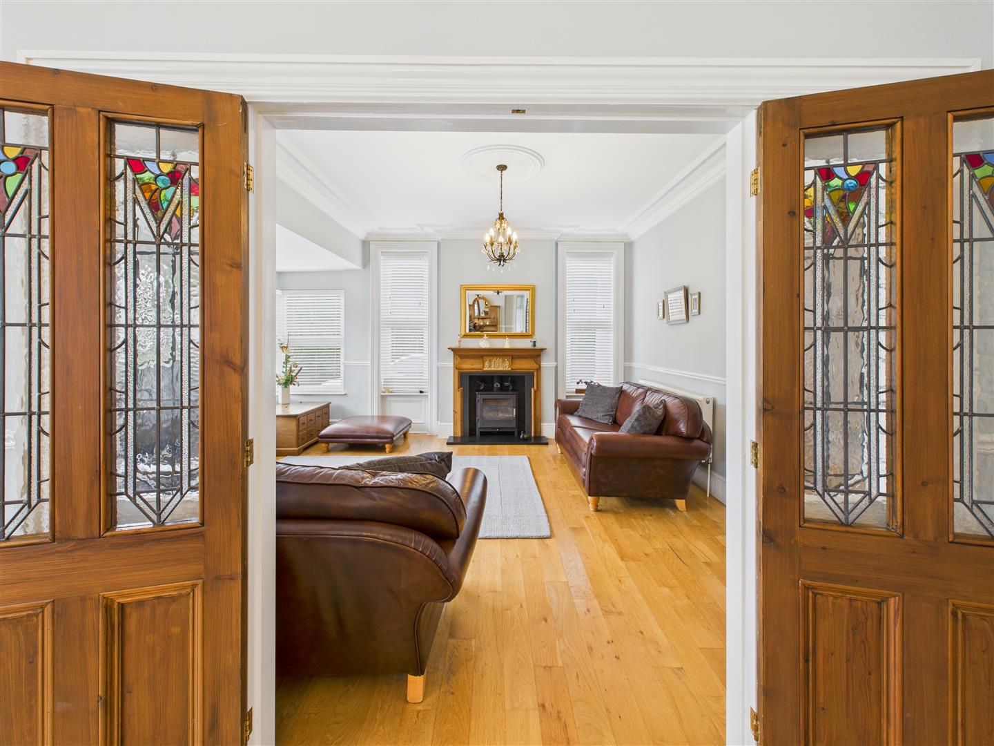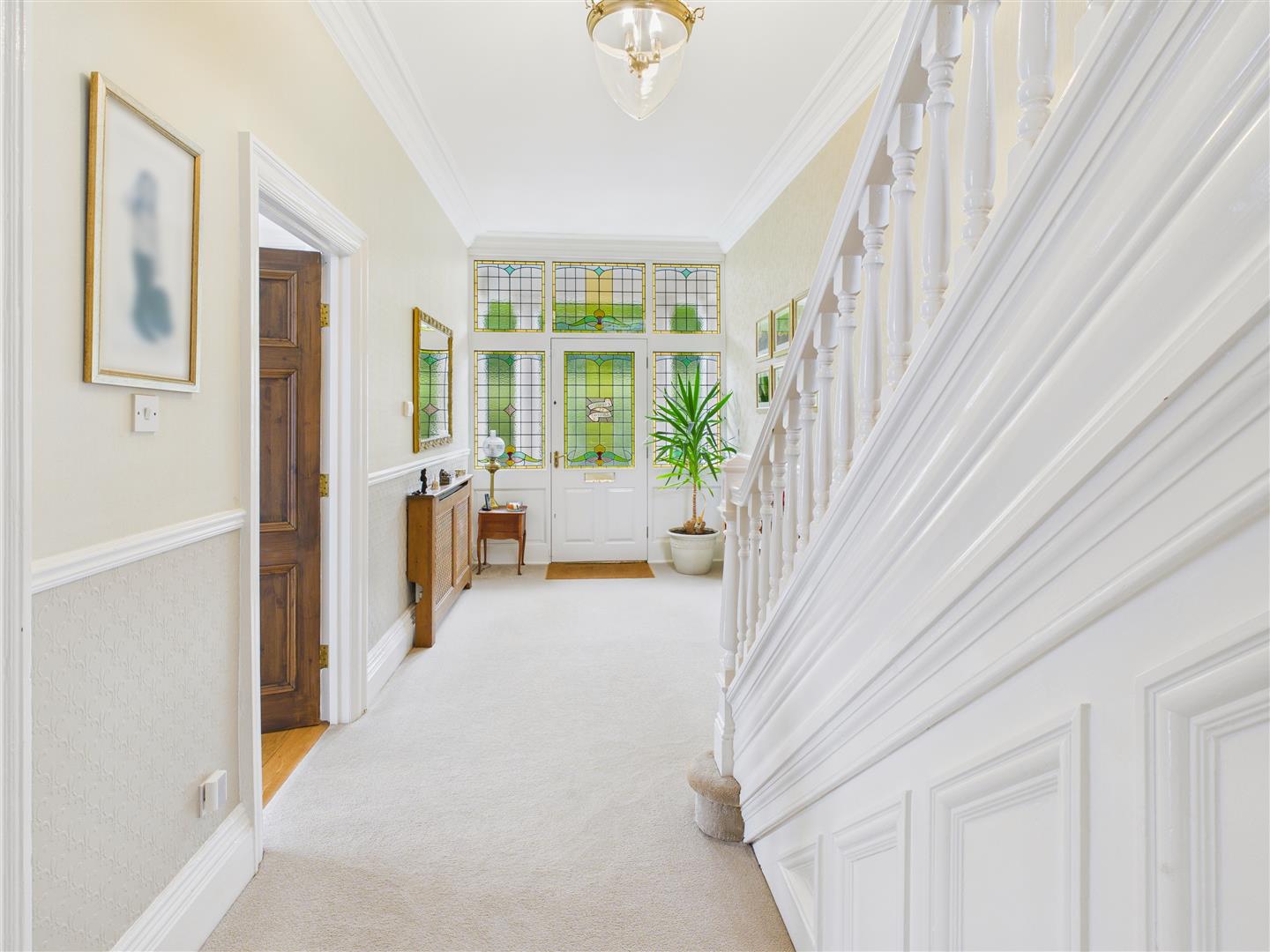 Steps lead up to a porticoed storm porch. An impressive entrance door has inset original stained glass glazing with inscription and matching side panels plus top lights. The striking hallway has a turning staircase leading up to the galleried landing and high ceiling is complete with moulded coving.
