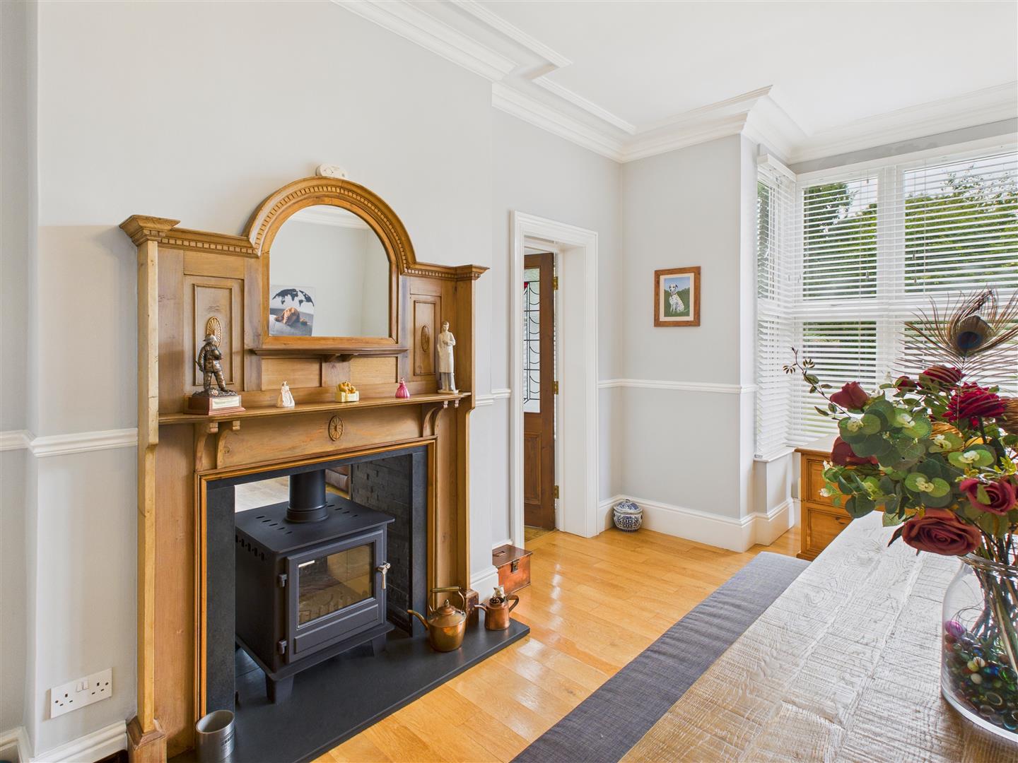 A wonderful place to entertain with large picture window overlooking the grounds to the front. Again with a stunning high ceiling, beautiful coving and ceiling rose. The focal point of the room is a feature 3/4 height carved fire surround with inset mirror housing a dual aspect log burner on a granite hearth with reverse side into the Garden Room.