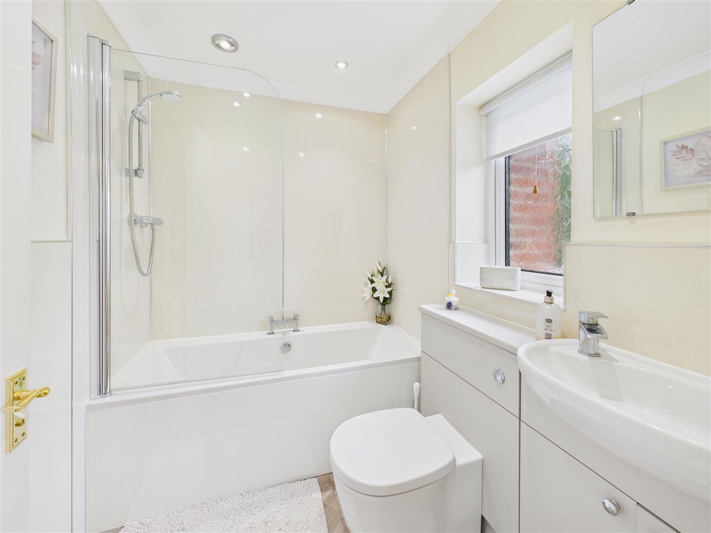 Stylish suite comprising bath with shower over and screen, fitted furniture with inset wash hand basin and concealed flush W.C., heated towel rail.