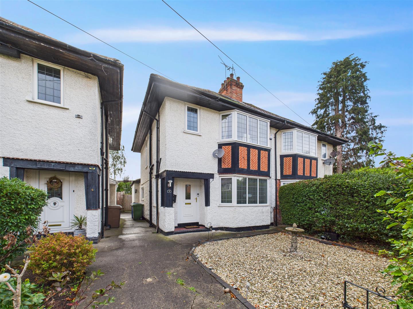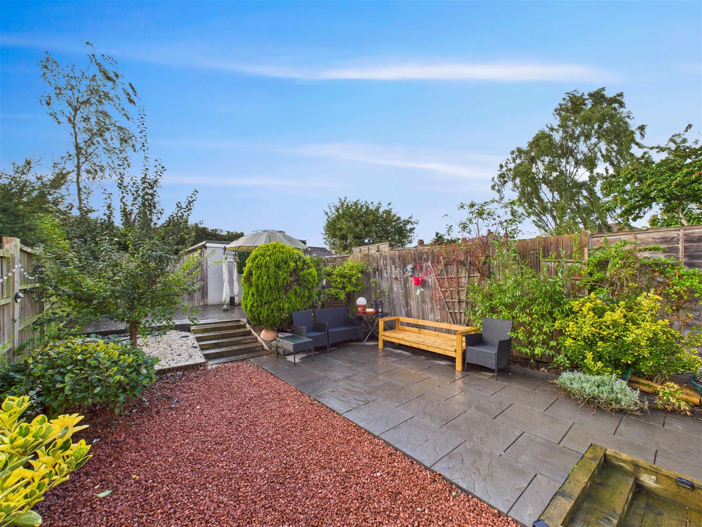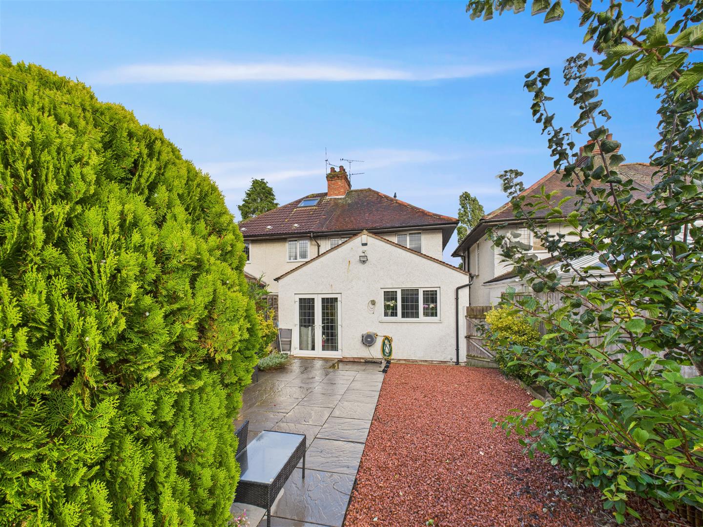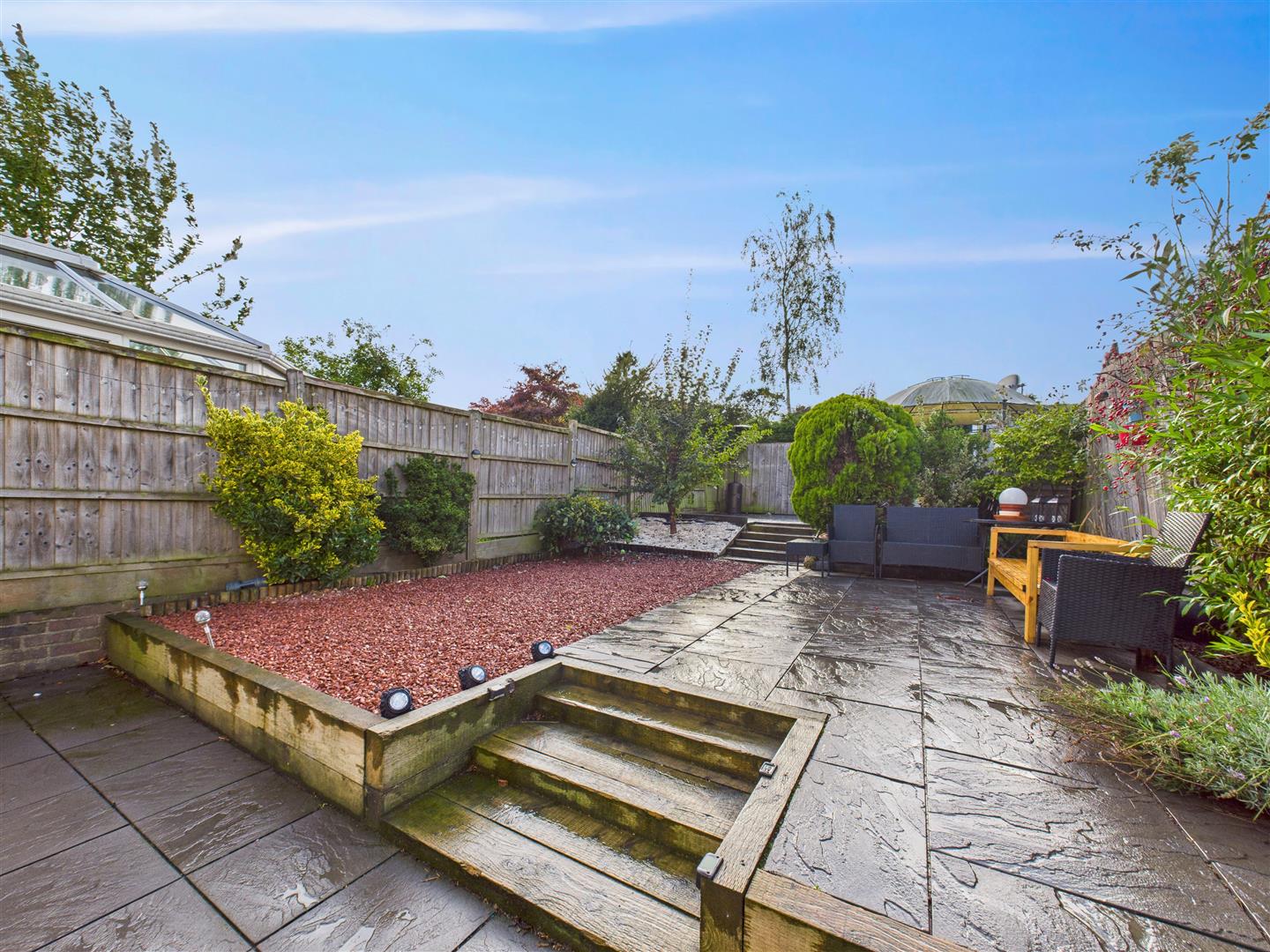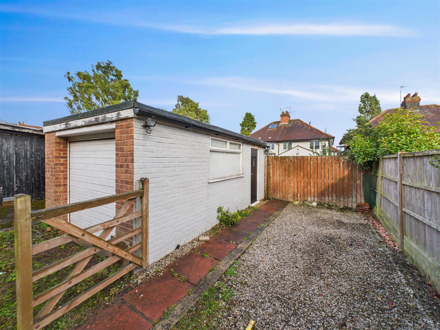 There is a generously sized and gravelled area to the front of the property. French doors from the kitchen open out to the attractive and low-maintenance rear garden, featuring three different levels of paving. The garden leads to a detached garage alongside one off-street parking space, with additional on-street parking being available on the cul-de-sac to the front.
