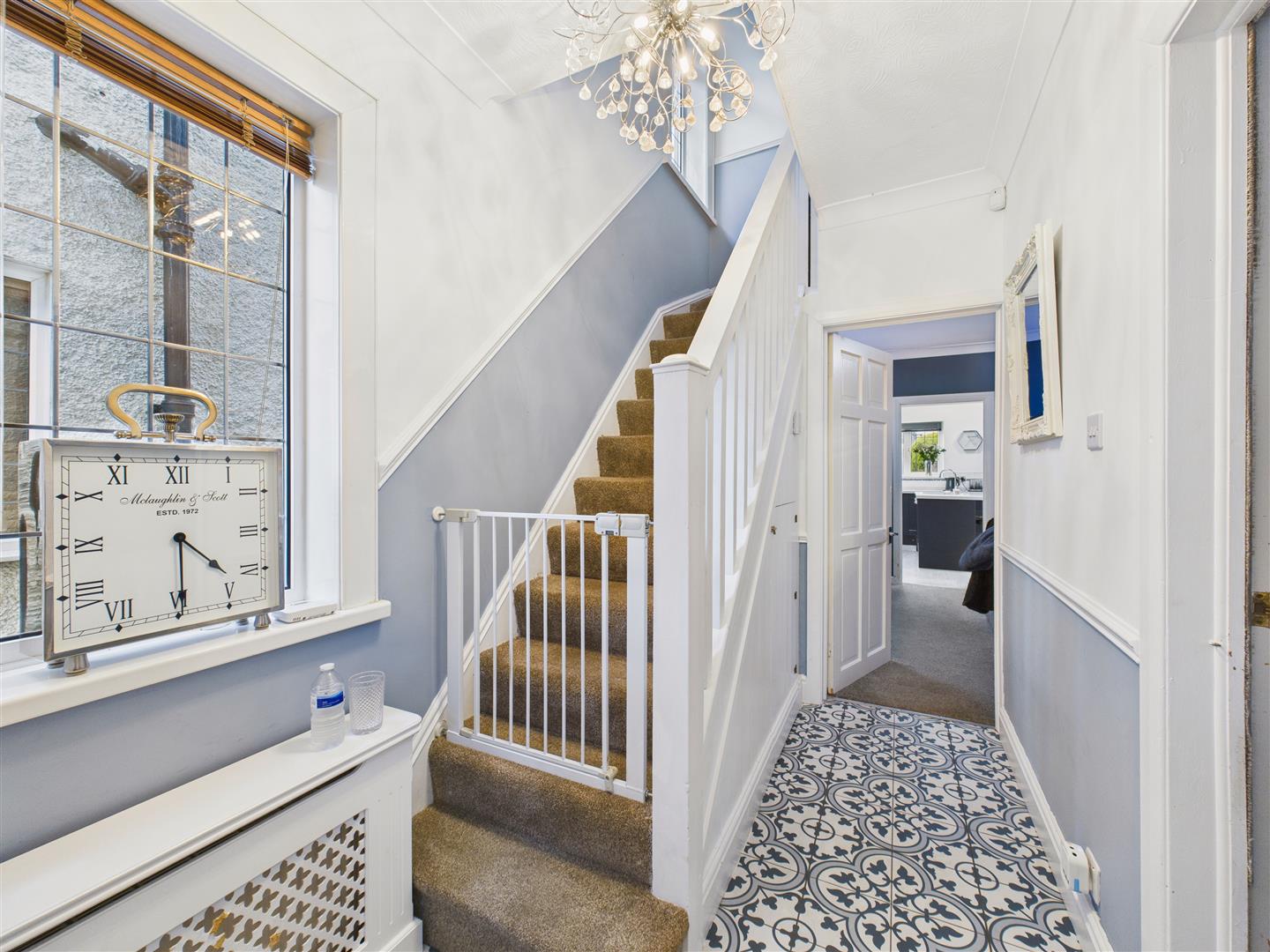 Tiled entrance area with window to side, stairs to first floor and understairs storage cupboard.