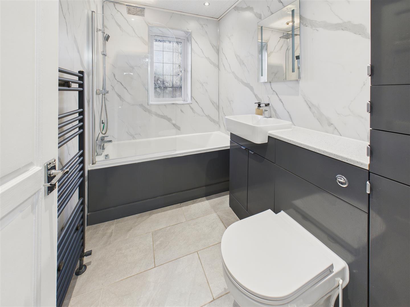 Recently fitted bathroom with underfloor heating, comprising wash-hand basin atop fitted vanity unit, low-flush W.C. and bath with shower screen and fitting beneath window to the front elevation.