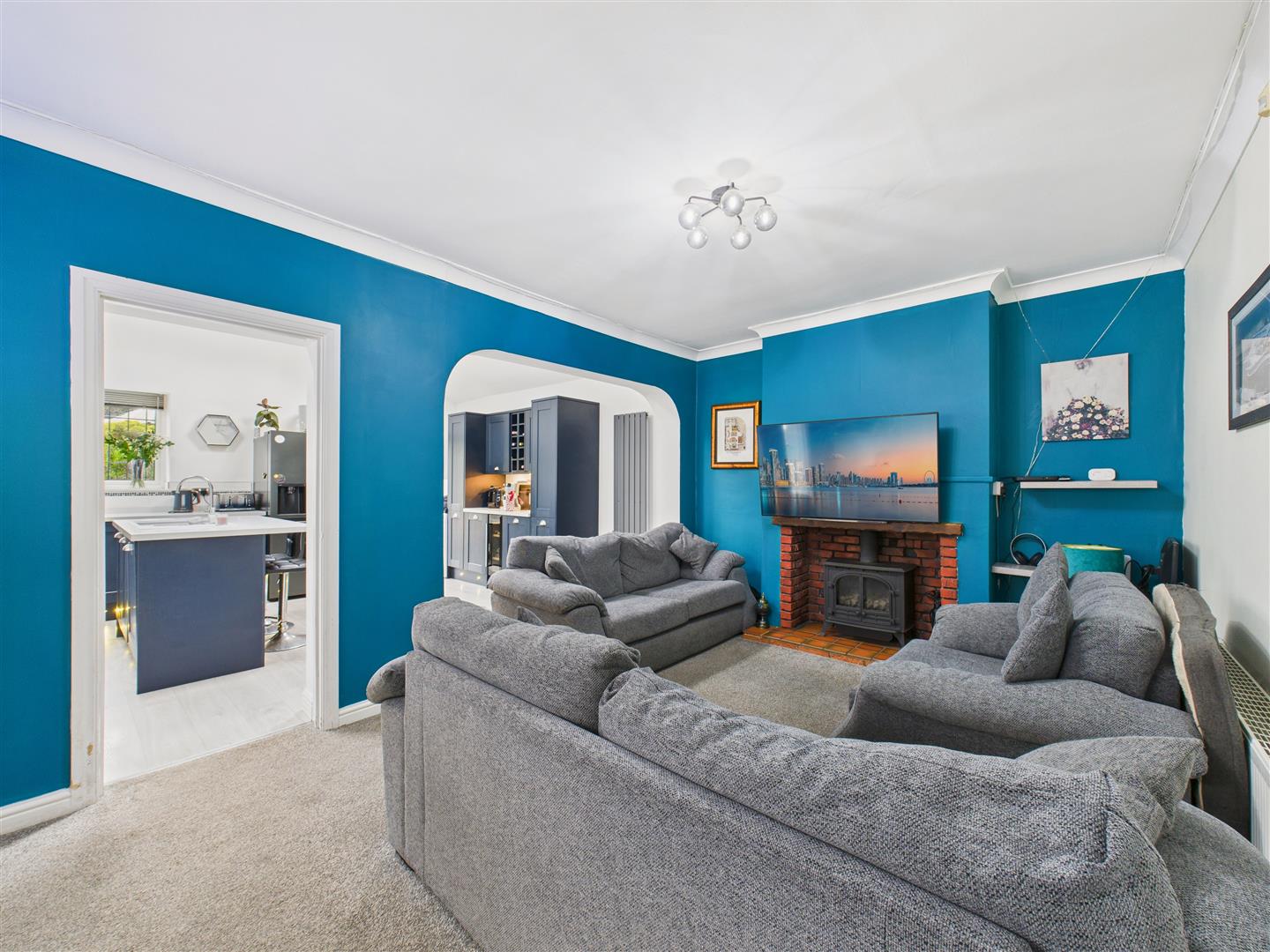 With a window to side, storage cupboard to corner and feature log burner with tiled hearth and exposed brick surround. A door and archway lead through to the kitchen.