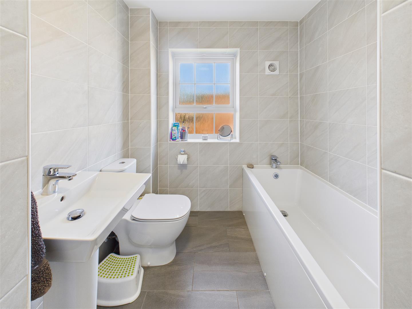 With suite comprising a bath, shower enclosure, wash hand basin and low flush W.C. Tiling to walls and floor, heated towel rail and window to rear.