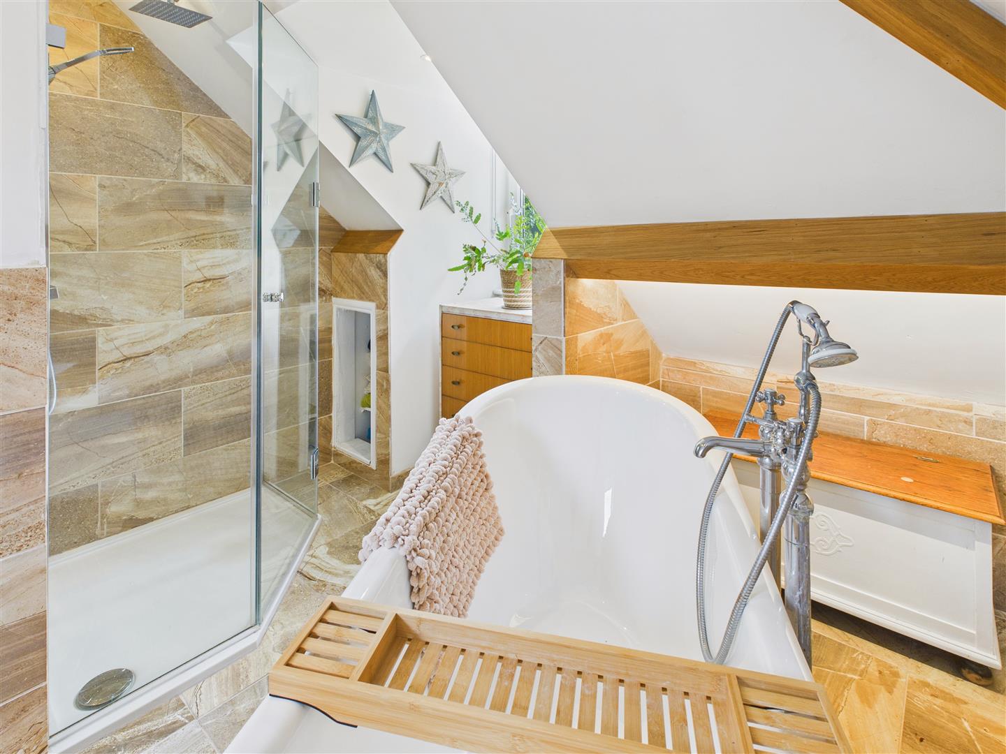 A stunning suite comprising a freestanding oval shaped bath with tap stand, low level W.C., twin wash hand basin and cabinet, bespoke shower cubicle with rainhead and handheld shower system, tiling to the walls and floor, heated towel rail.