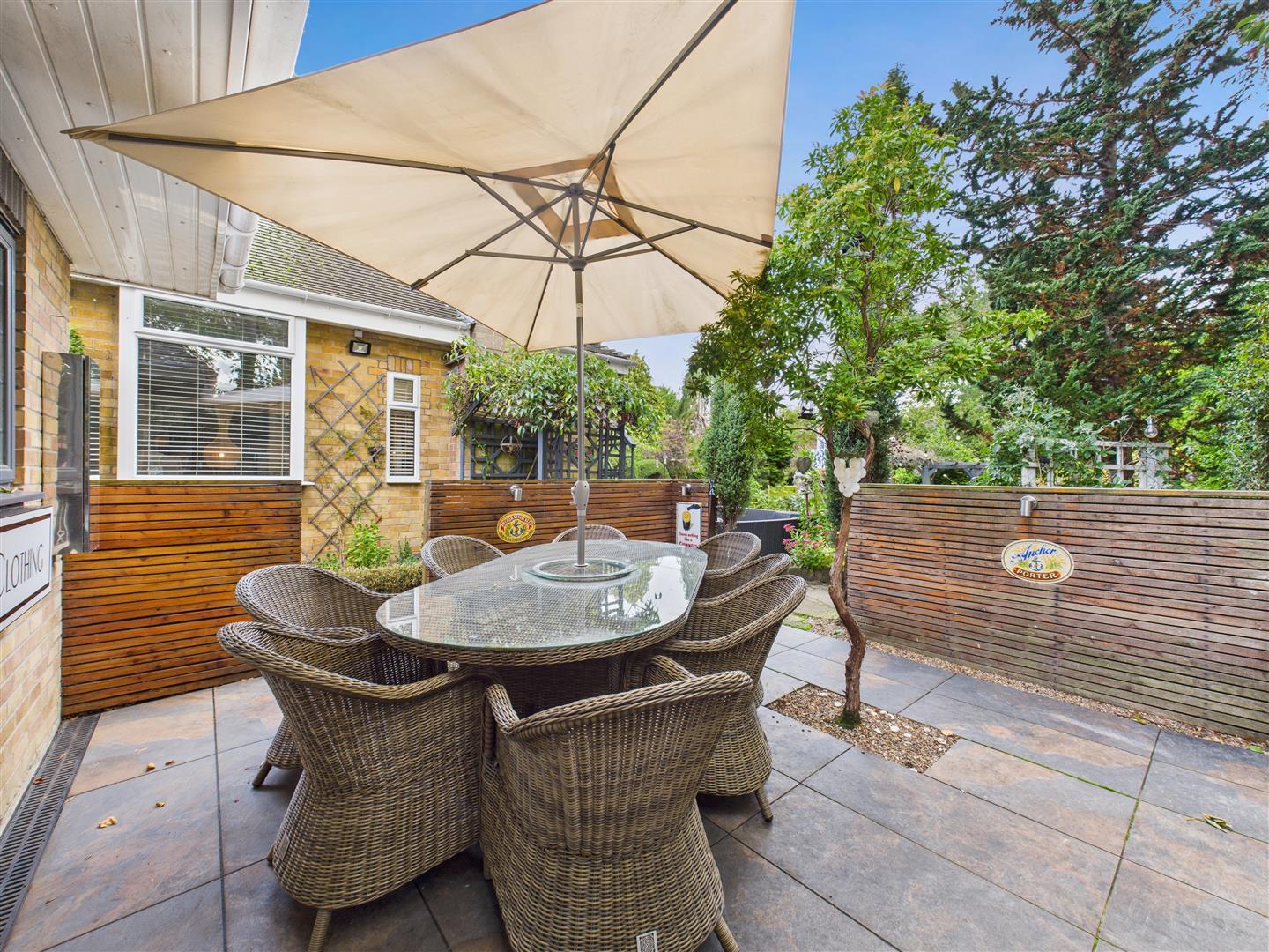 Featuring porcelain tiled patio, wooden slat panelling, 2 barbeques with lighting and power.