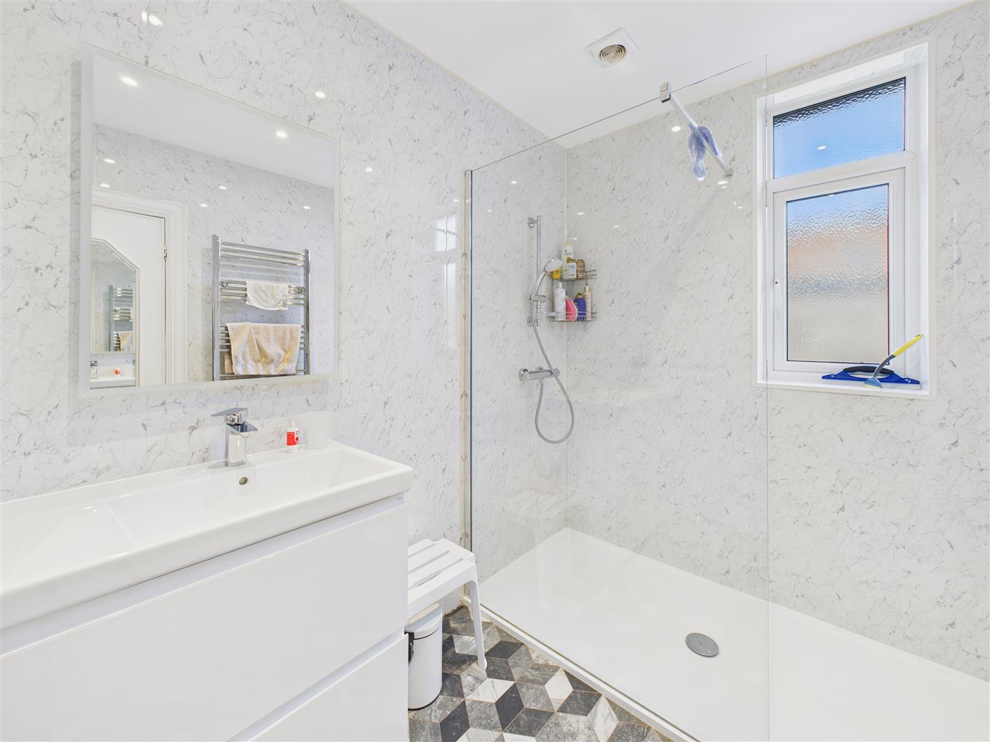 With large shower cubicle, wash hand basin in cabinet.