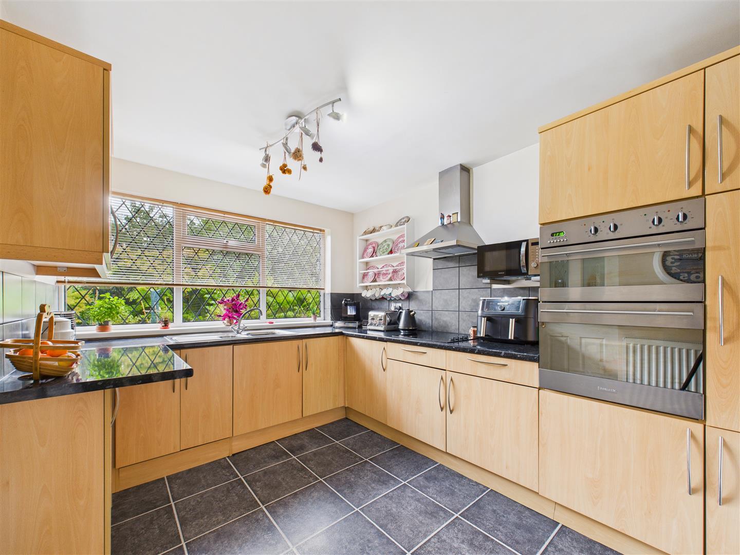 Having a range of fitted base and wall units with laminate worktops incorporating a one and a half bowl sink and drainer plus a host of integrated appliances including a double oven, four ring hob with filter hood above, dishwasher, freezer and washing machine. There is also space for a fridge/freezer. Window to rear.