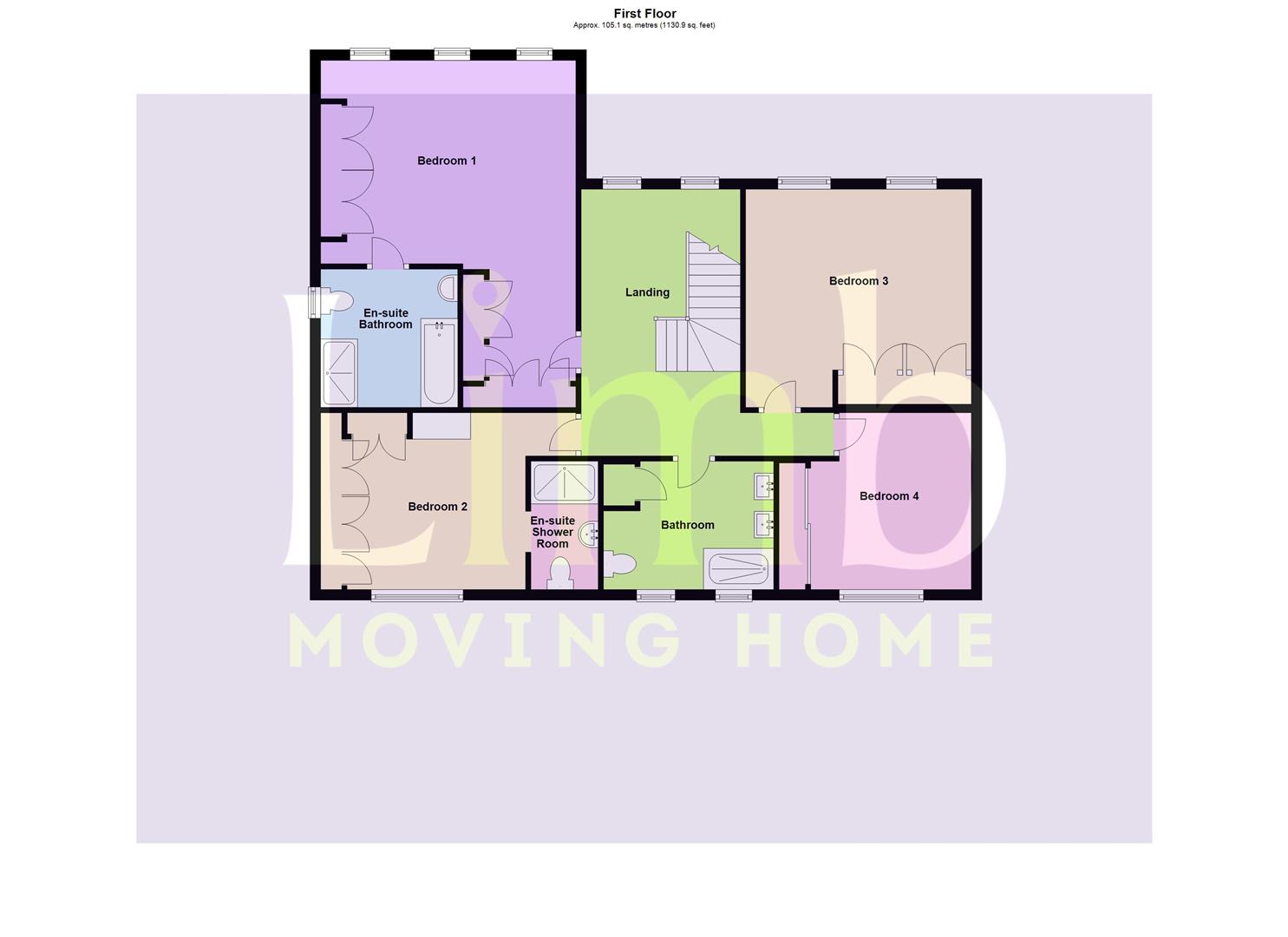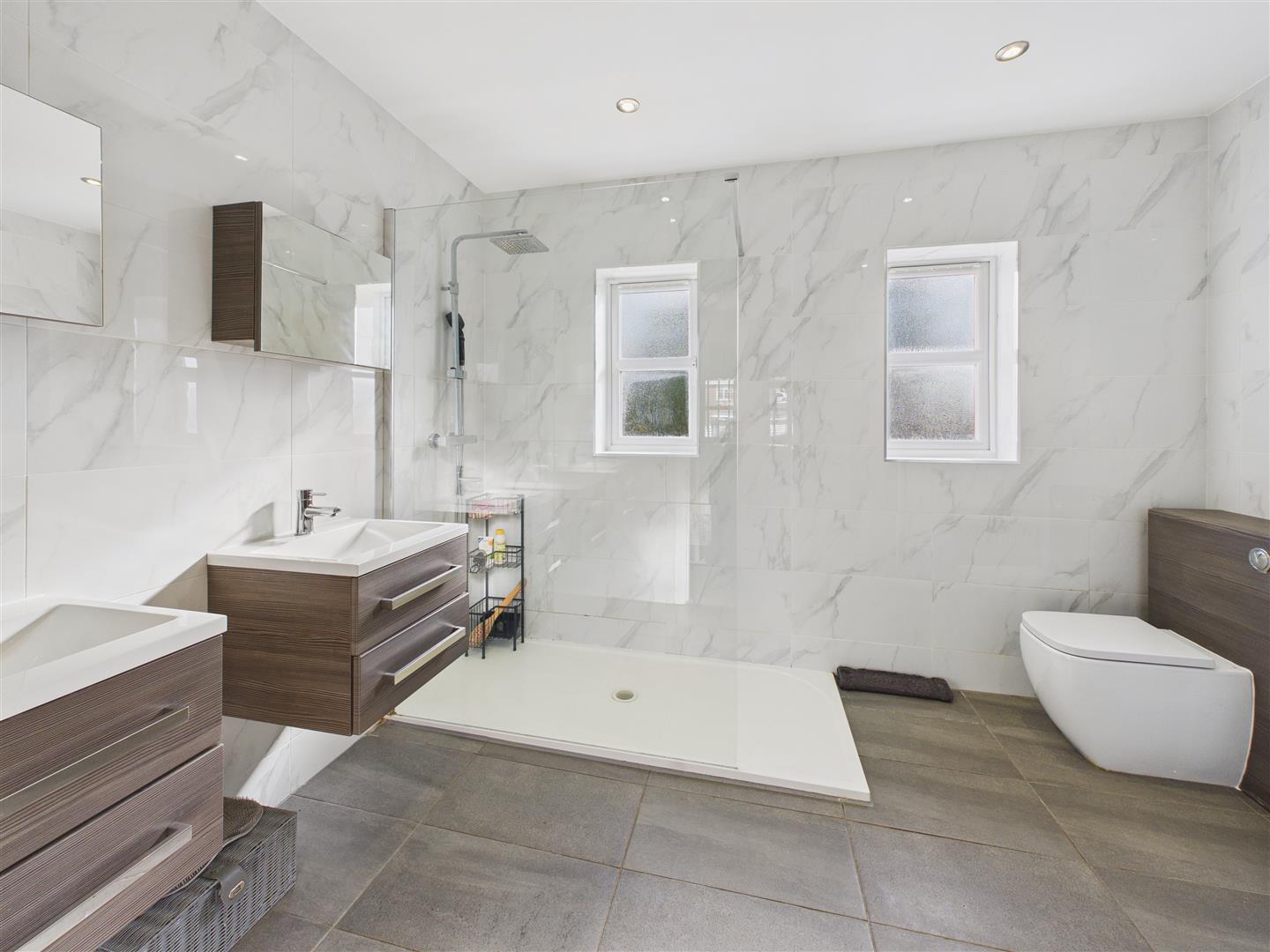 With suite comprising twin wash hand basins, low level W.C. and "walk in" shower, airing cupboard to corner. Tiling to walls and floor.