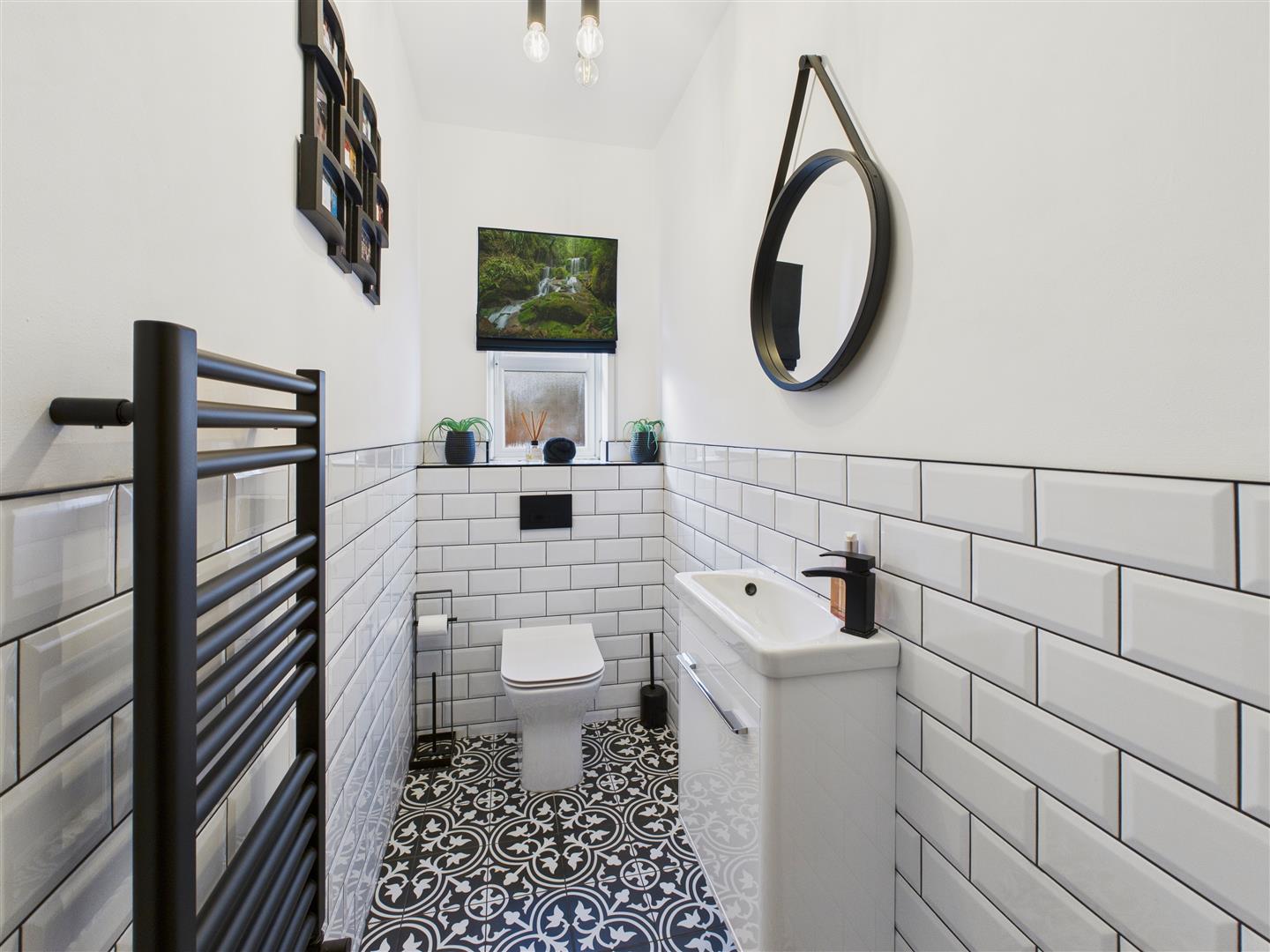 Contemporary suite with W.C. and wash hand basin with cabinet heated towel rail and tiled floor.