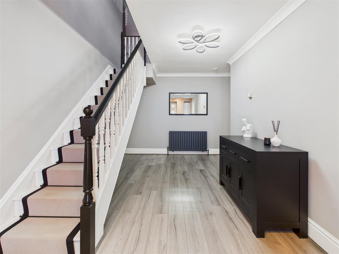 This stunning and deceptively spacious detached house affords a most impressive range of contemporary accommodation, spacious rooms and a south facing garden complete with chalet. The property has been significantly remodelled and extended to provide up to date living space with the practicalities of a family home. A particular feature is the magnificent dining kitchen with an array of sleek units, matching island and bi fold doors out to the balcony. This room leads to both a snug and a beautiful living room with solid fuel stove and doors out to the garden. There is also a separate lounge, fitted study, utility and a large entrance reception with cloaks/WC. situated off. At first floor a large galleried landing provides access to four spacious double bedrooms, two with en-suites and there is a four piece family bathroom. The accommodation boasts gas fired central heating to radiators and uPVC double glazing. Excellent parking is available to the front in addition to a shortened double garage which is currently used as a gym. The rear garden enjoys a southerly aspect with an extensive paved patio and lawn beyond. Features include a hot tub with gazebo and a garden chalet ideal as a further entertaining space/bar or alternatively an outdoor office.