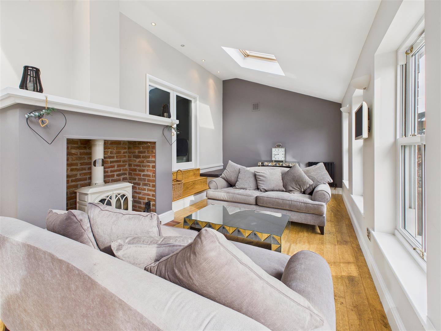 A beautiful room situated to the rear of the house with three windows overlooking the garden plus double doors leading out, two Velux windows to the vaulted ceiling. A central chimney breast houses a solid fuel stove.