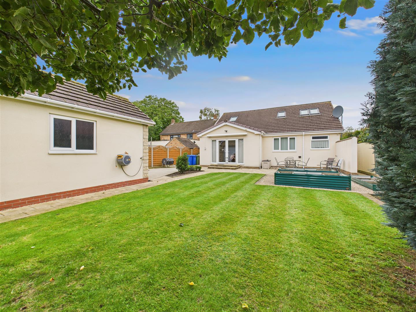 Wrought iron gates lead to the side and give access to the rear and detached garage, which includes storage units plus electricity and water supplies. The rear garden is lawned with patio area, vegetable planters and fencing to the boundary.