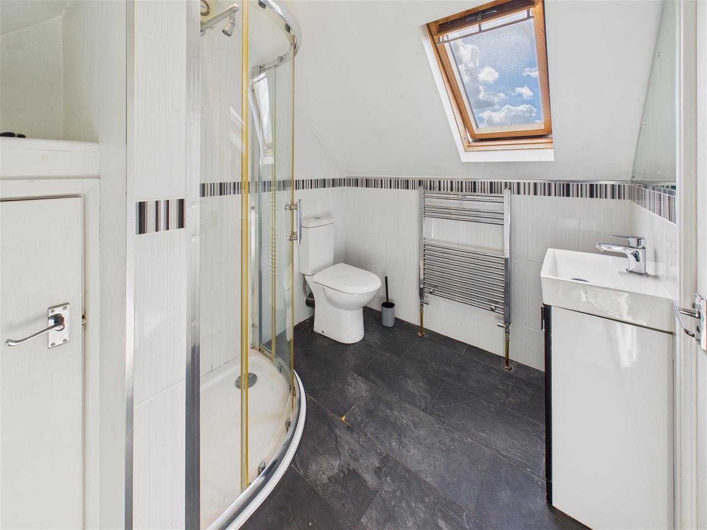 Comprising shower enclosure, low-flush W.C., wash-hand basin atop vanity unit, Velux window and storage cupboard to corner.