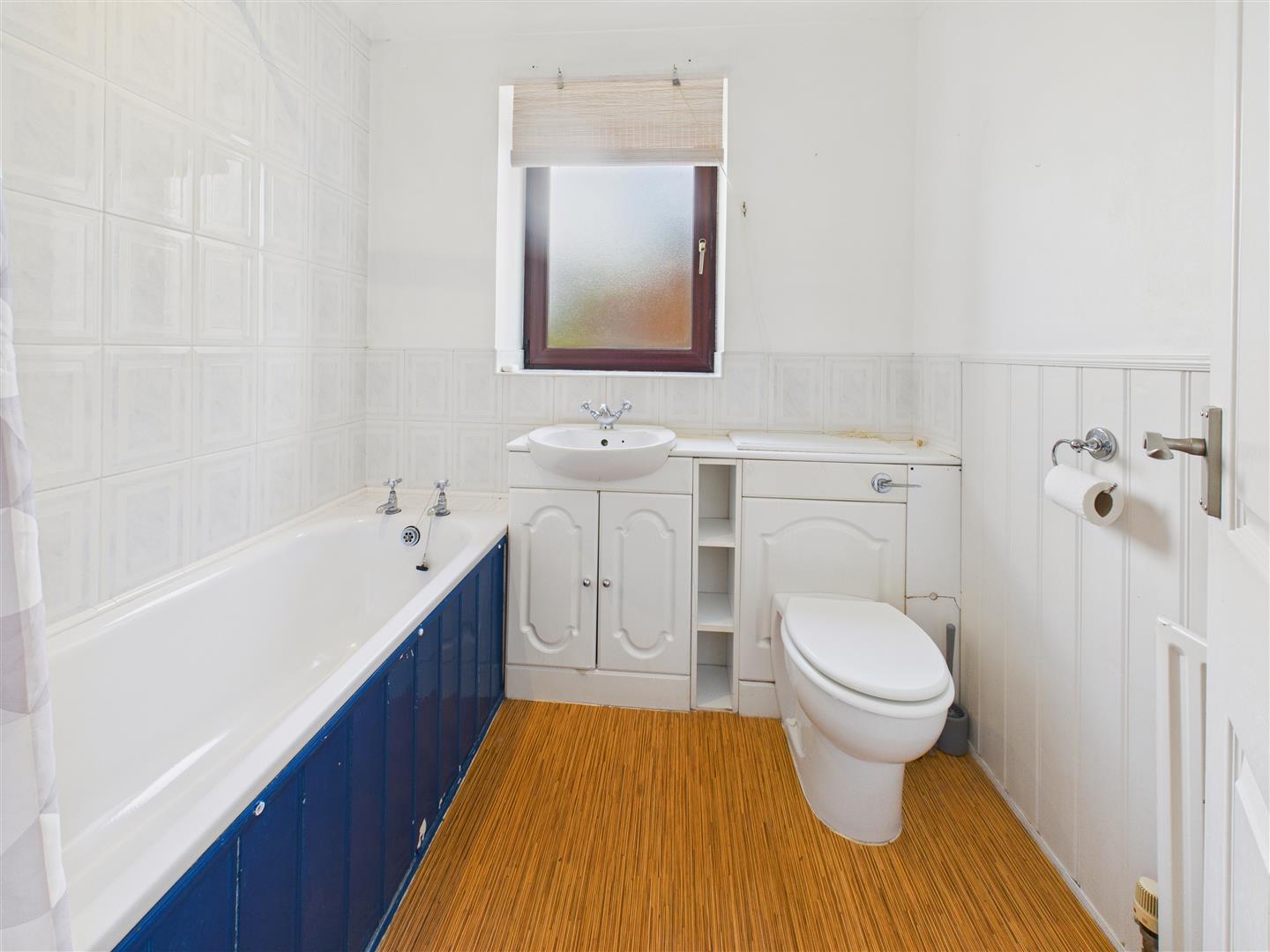 Comprising low-flush W.C., bath with shower fitting and tiled surround and wash-hand basin atop fitted vanity unit beneath a window to the side elevation.