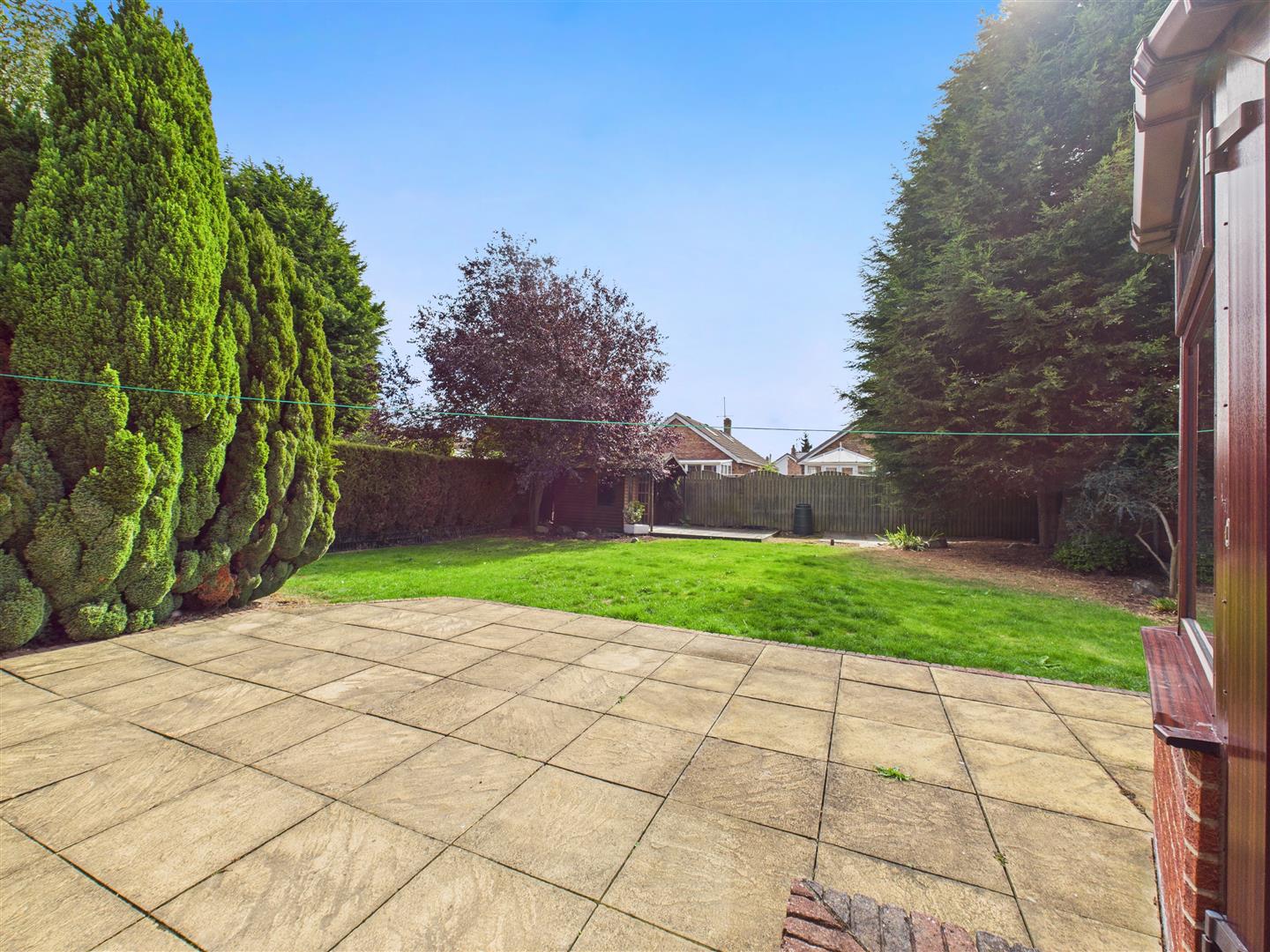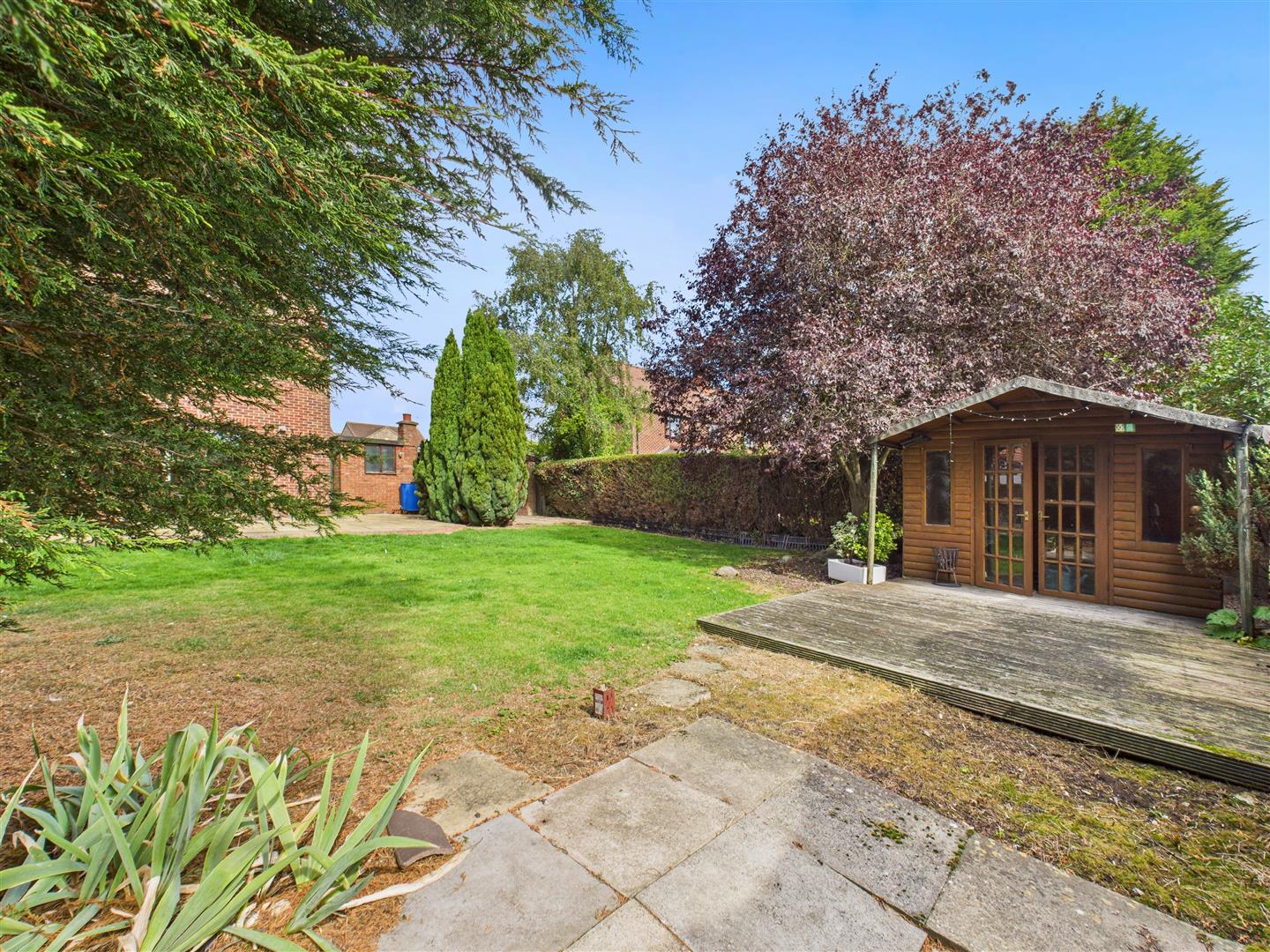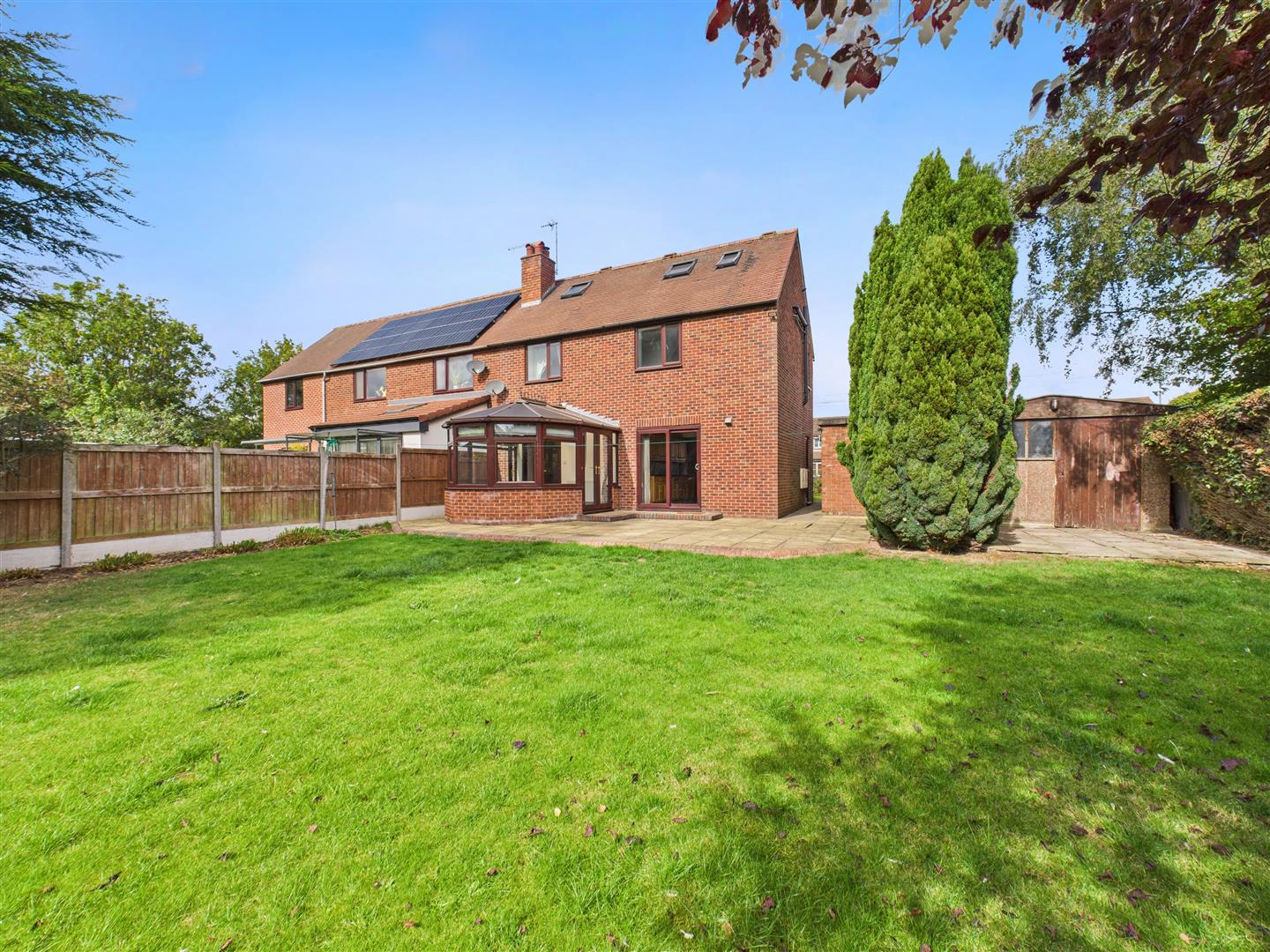 The spacious, south-facing rear garden features a paved patio to the immediate rear of the property, followed by lawn and additional patio space with summer house. To the side of the property, there is a brick outbuilding with a W.C., coal house and additional store room. There is off-street parking space for up to four vehicles on the driveway to the front of the property, which leads to a garage. A lawn to the front provides green space or potential for additional parking, if desired.