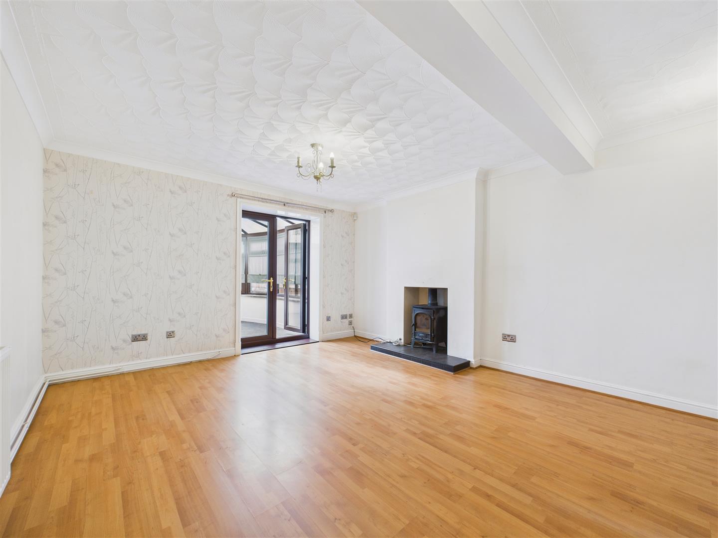 With log burner stove, understairs storage cupboard access and double doors to conservatory.