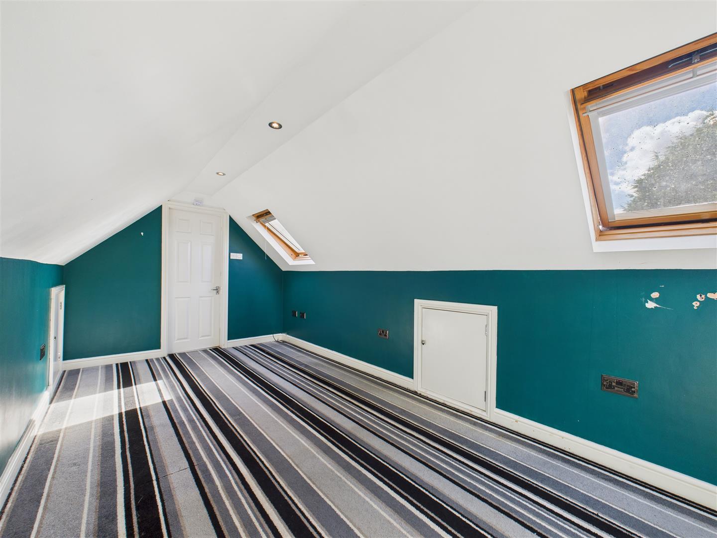 With Velux windows and access to eaves storage space. There is an additional storage cupboard to the corner.