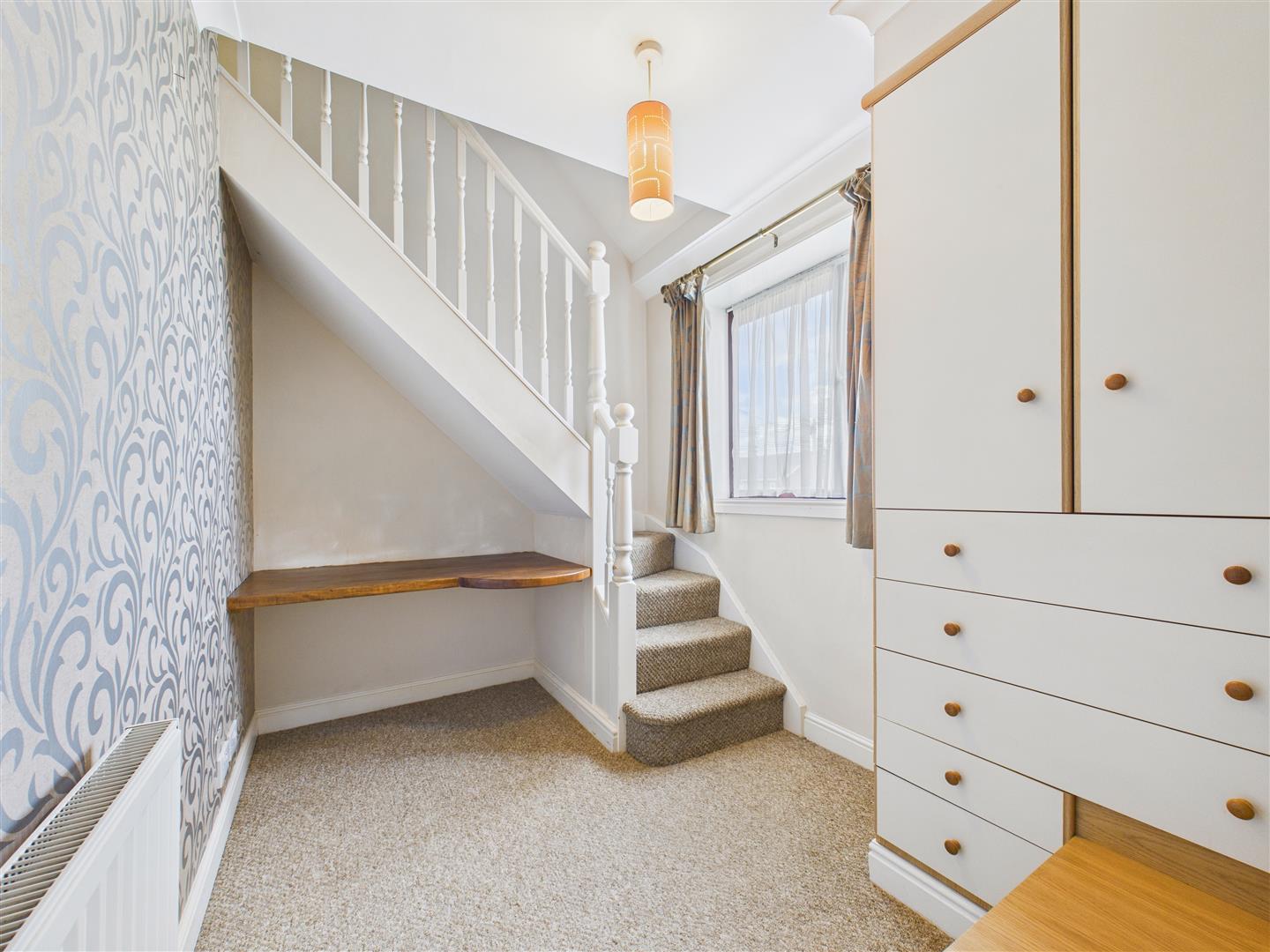 Comprising fitted wardrobe, drawer space and a desk beneath stairs to the second floor. Window to the front elevation.
