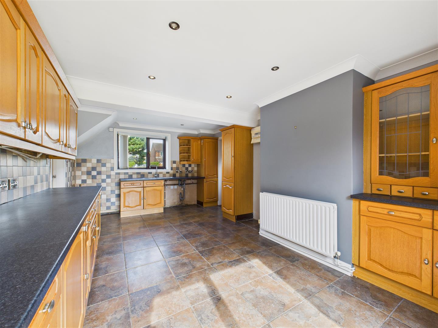 With a range of fitted worksurfaces and units, sink & drainer beneath a window to the front. There are sliding doors onto the rear patio from the dining area.