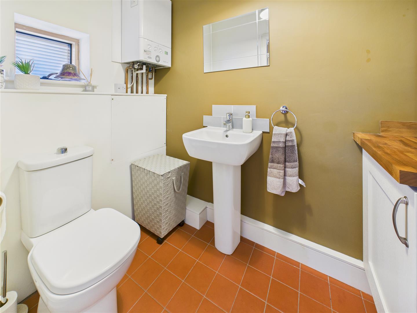With low-flush W.C. beneath window to front, wash-hand basin and plumbing for washing machine beneath worksurface area and storage cupboard.