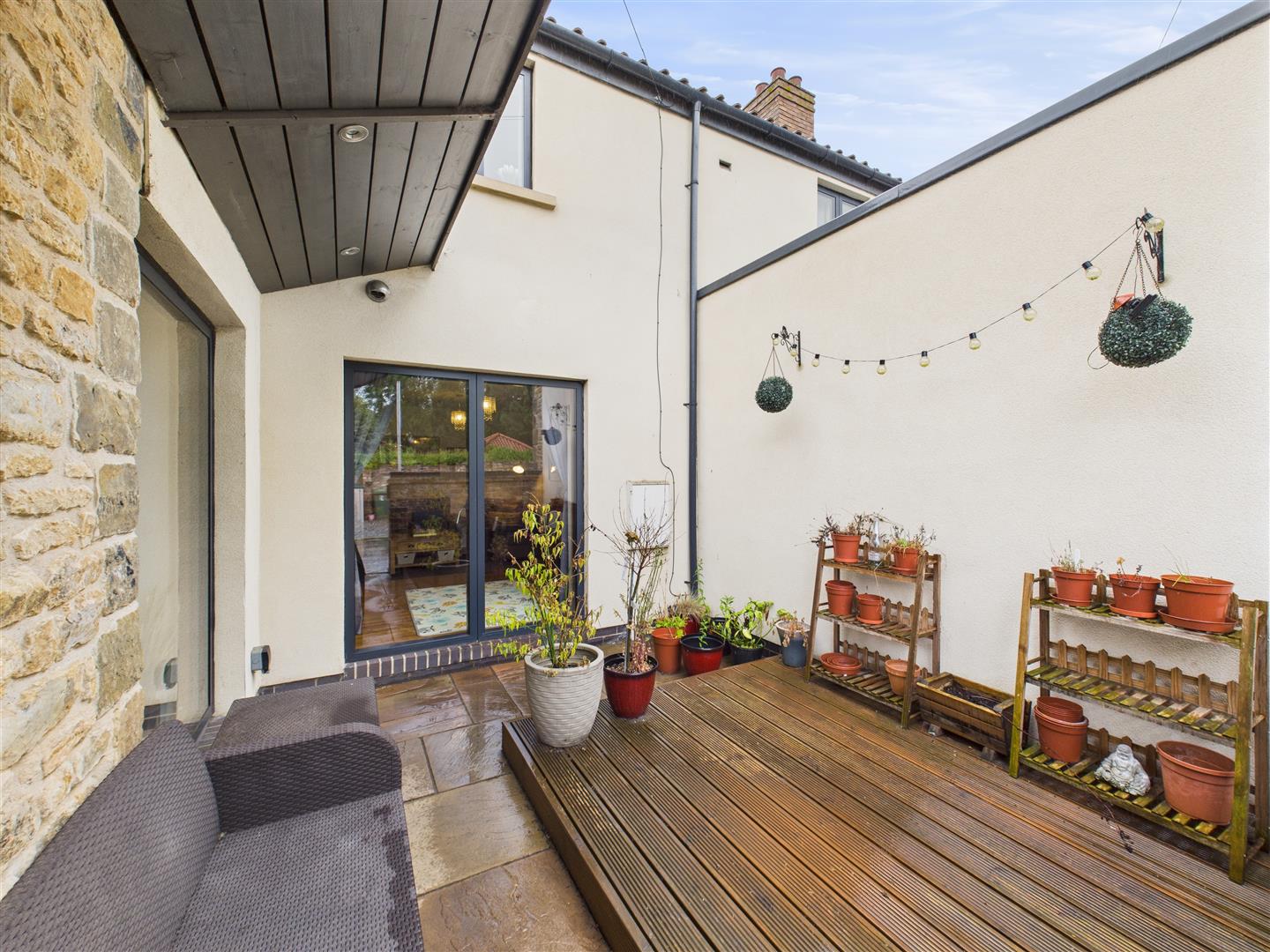 A paved and walled private courtyard lies to the side of the property, complete with a shelter canopy extending from the property and a decked area. There is a shared driveway to the front of the property, with two off-street parking spaces allocated.