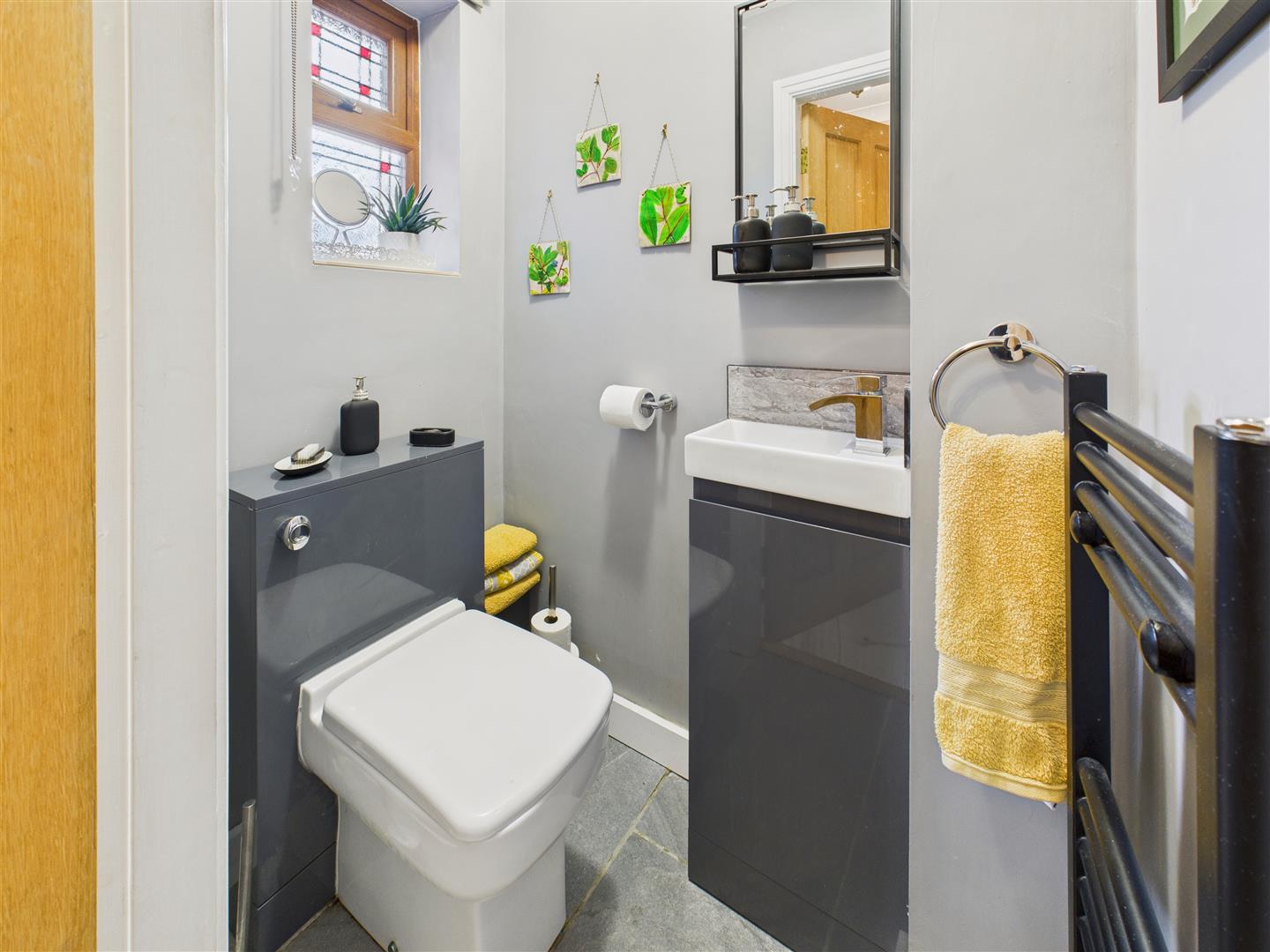 With low flush W.C. and vanity unit with wash hand basin. Heated towel rail and window to front.