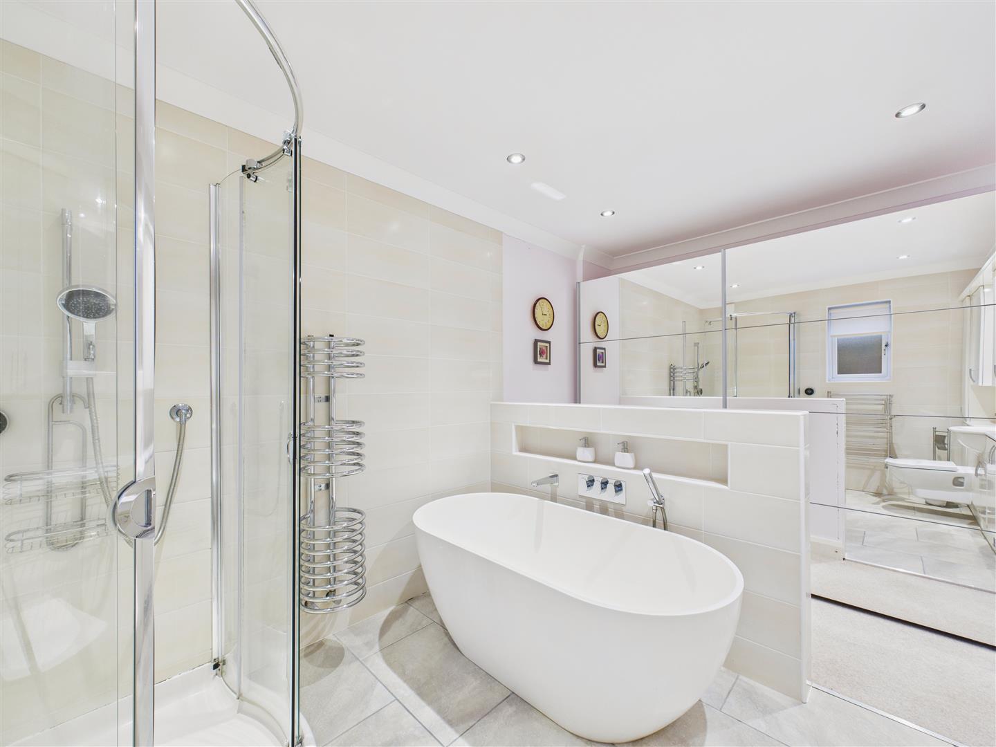 With fitted wardrobes with mirror fronted sliding doors. The luxurious en-suite comprises fitted units with wash hand basin and low flush W.C., oval bath with shower attachment and a separate shower enclosure, Tiled floor, heated towel rail, inset spot lights and window to rear.