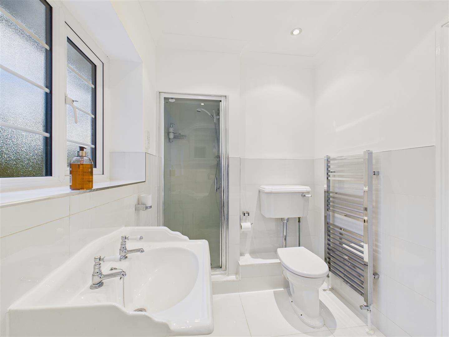 With luxurious suite comprising an oval roll top bath, shower enclosure, wash hand basin and low flush W.C. Heated towel rail, inset spot lights, tiled floor and windows to rear.