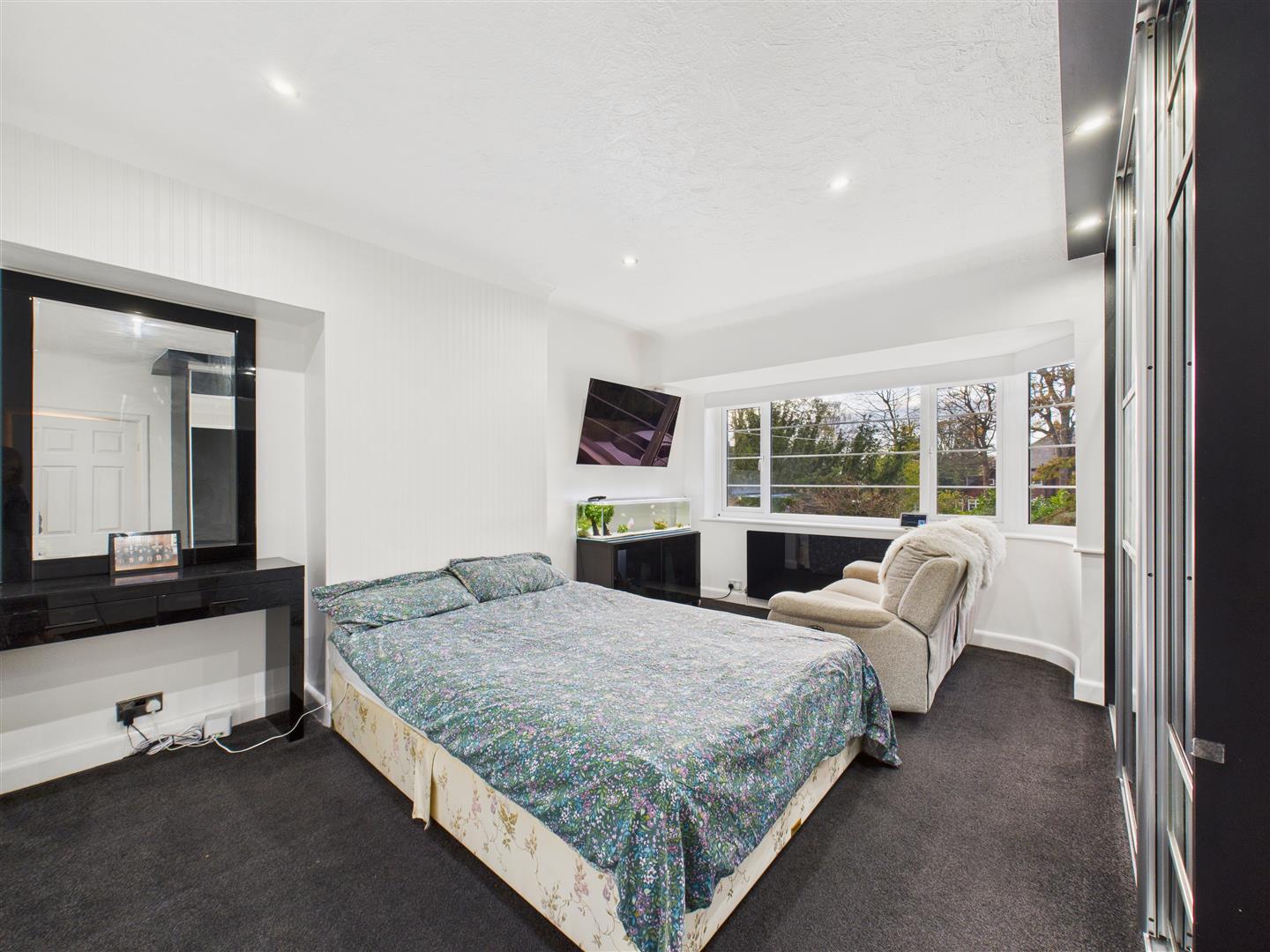 Fitted wardrobes with sliding doors. Window to the front elevation with remote controlled blackout blinds.