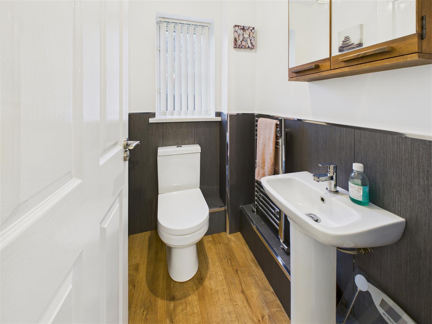 With modern suite comprising a shaped bath with shower over and screen, wash hand basin and low flush W.C. Heated towel rail and window to rear.