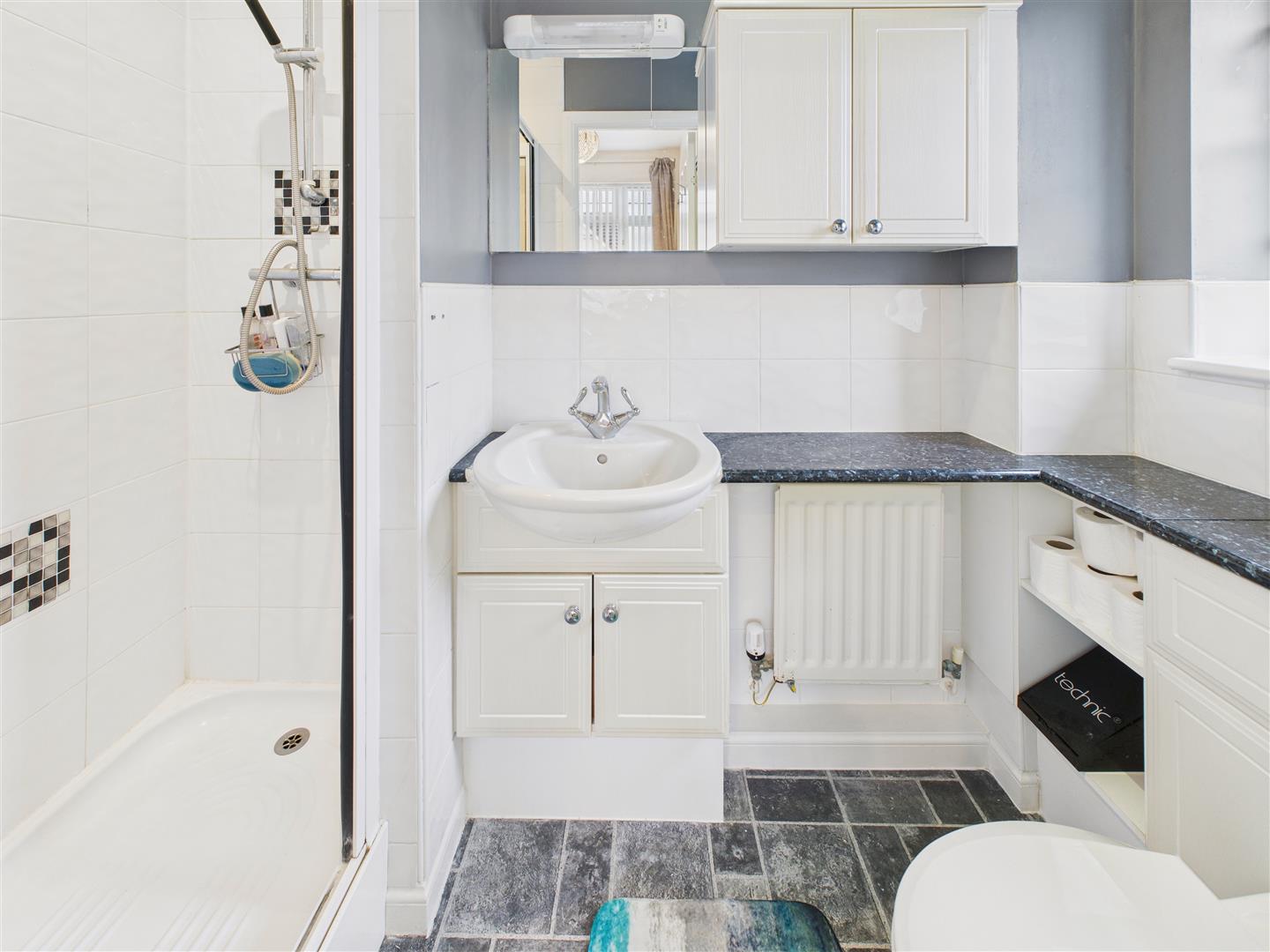With suite comprising a shower enclosure, fitted cabinets with wash hand basin and low flush W.C. Window to side.