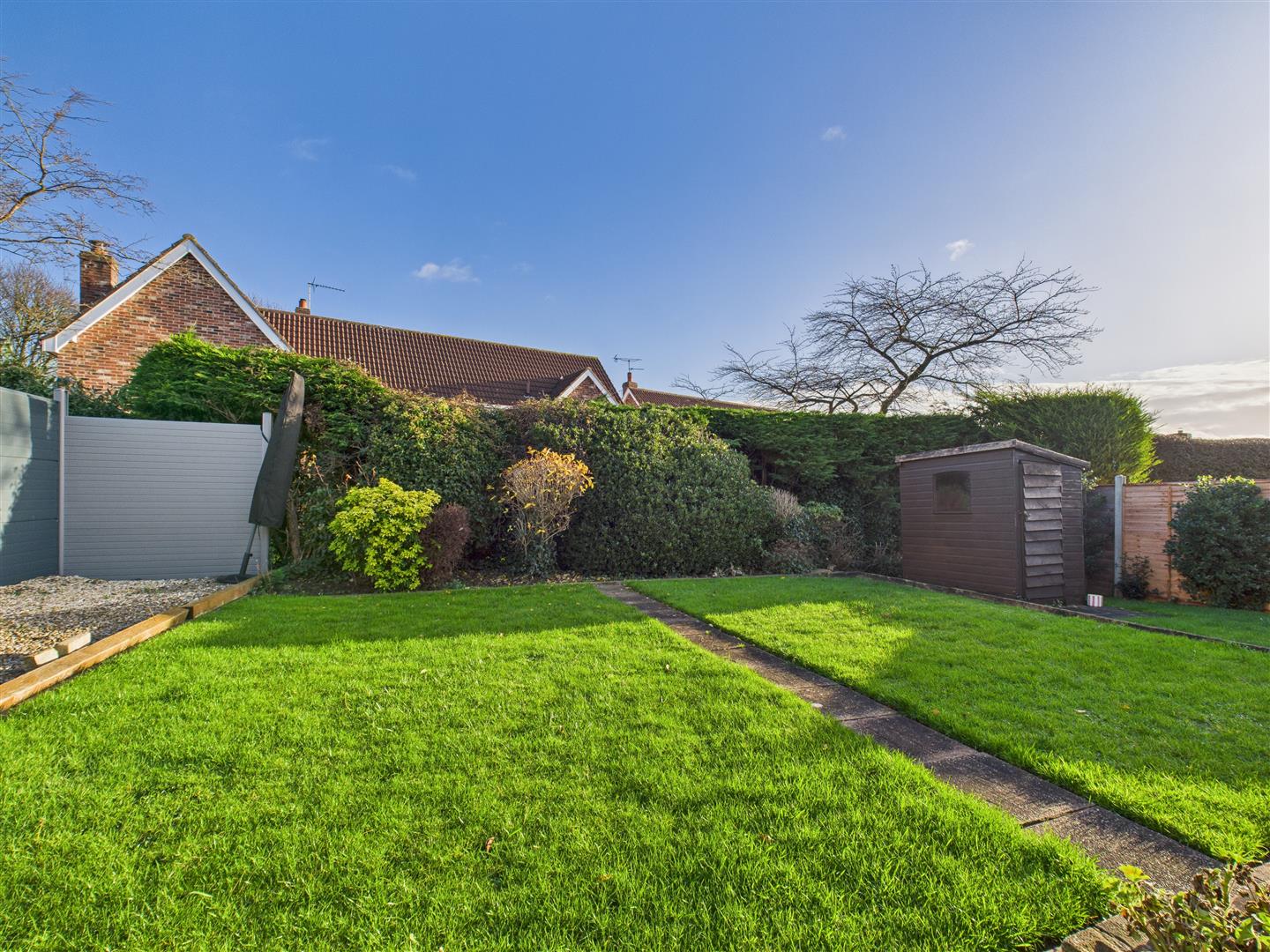 A lawned garden with a border planted with roses and shrubbery extends to the front. A side drive provides good parking and access to the single garage. To the rear lies a lawned garden with shed to one corner.