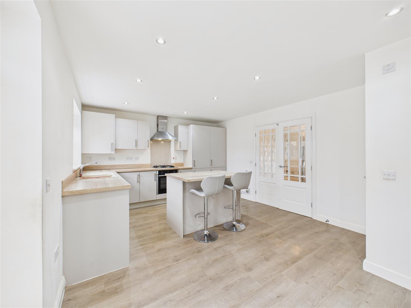 Having a range of modern base and wall units with complementing worktops and matching central island with breakfast bar. There is a one and a half bowl sink and drainer plus integrated appliances including an oven, four ring gas hob with filter hood above, fridge/freezer, dishwasher and washing machine. There is ample space for a dining table and chairs. French doors lead out to the rear garden.