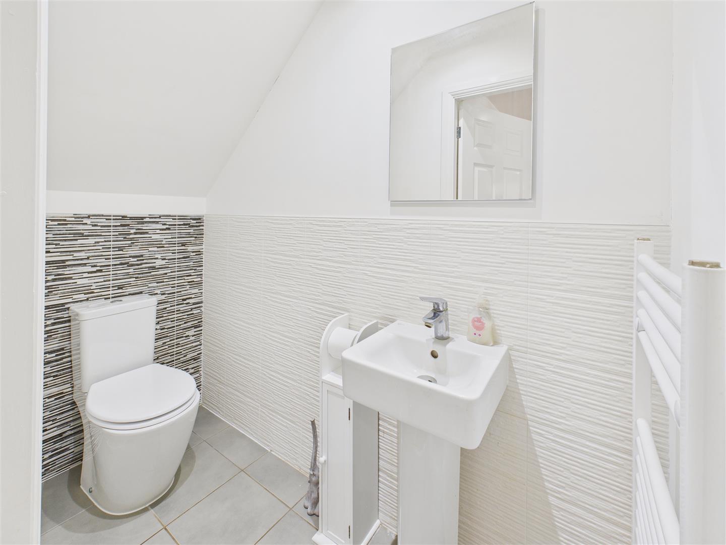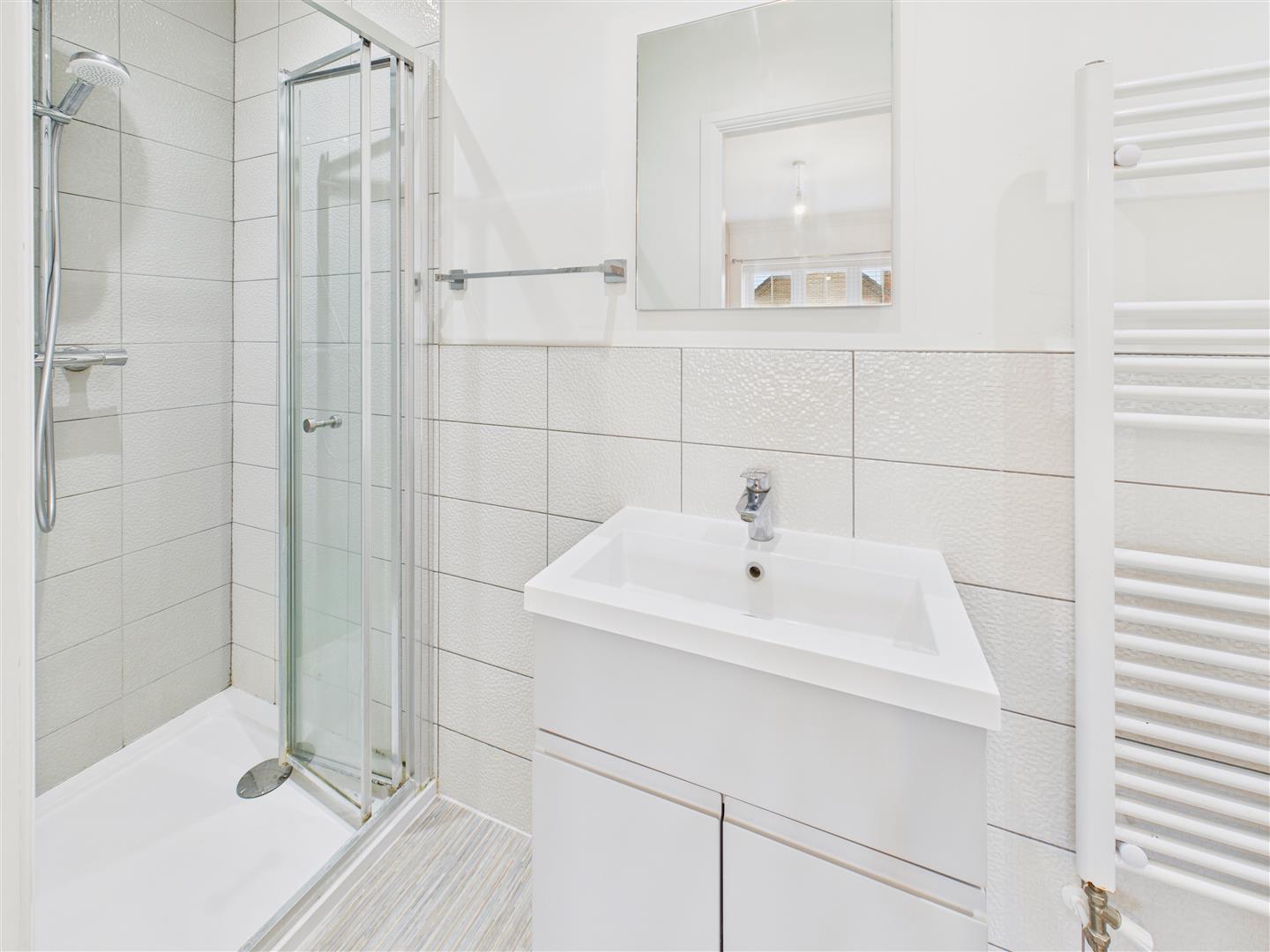 With suite comprising a bath with shower over and screen, wash hand basin and low flush W.C. Heated towl rail, window to front.