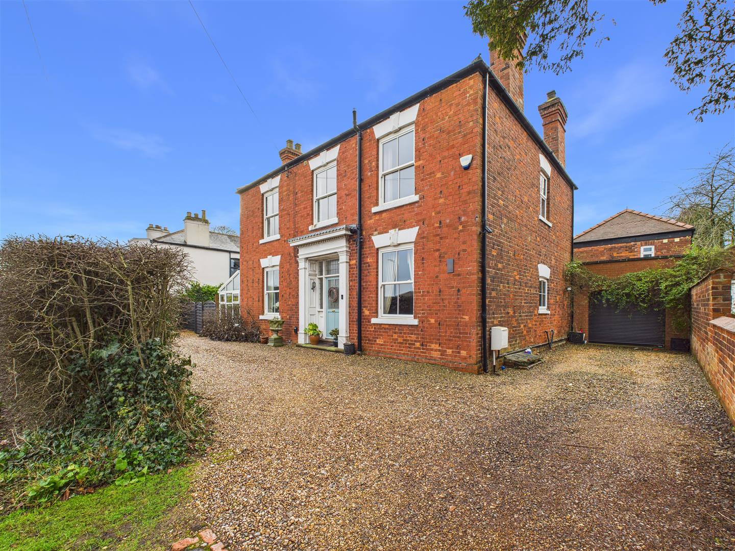 Outside, a hawthorn hedge extends to the front with driveway entrances to either side and a gravelled parking area in front of the house. There is also an attached garage to one side of the building. Overall the plot extends to approx. half an acre, the rear garden being set out in a traditional Victorian style combining lawns interspersed with shrub and perennial borders with classic Hellebore and Peony planting to the rear.
