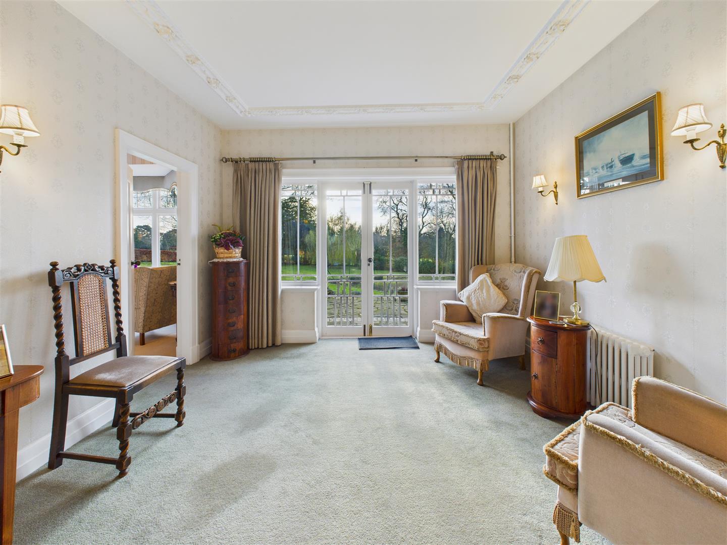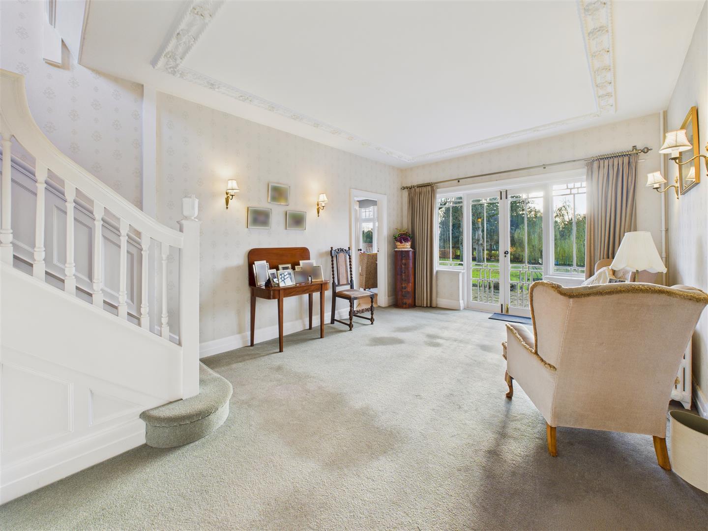 With a wall of glazing and French double doors looking south-west across the gardens and beyond, in addition to providing access to the paved terrace. The staircase leads up to the first floor. There is a beautiful plaster relief work to ceiling.