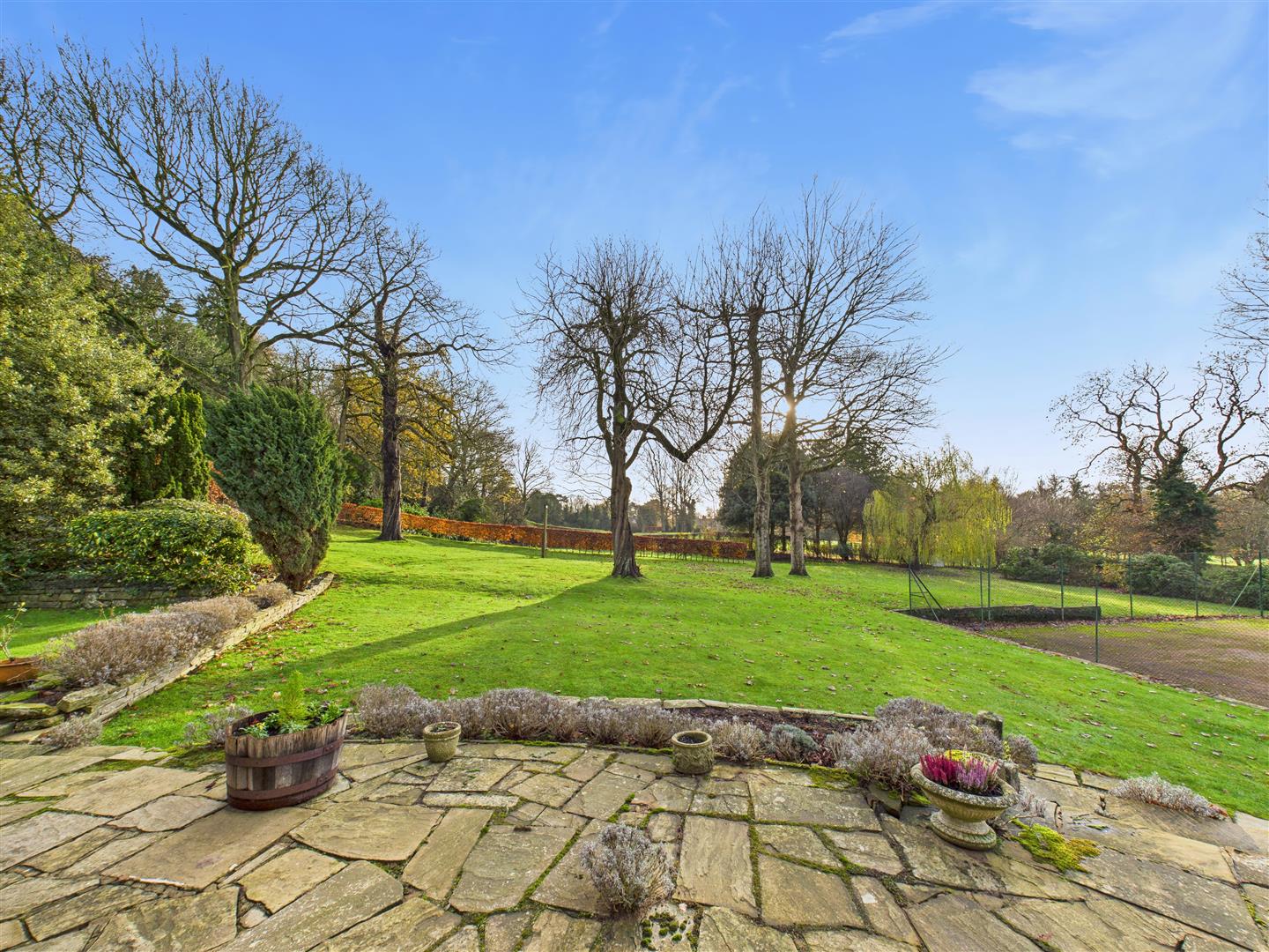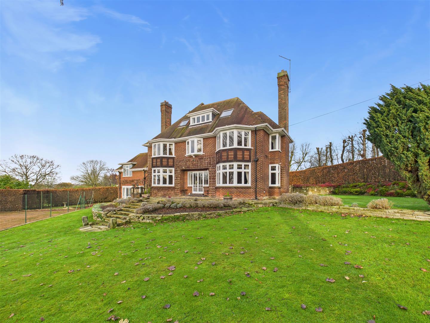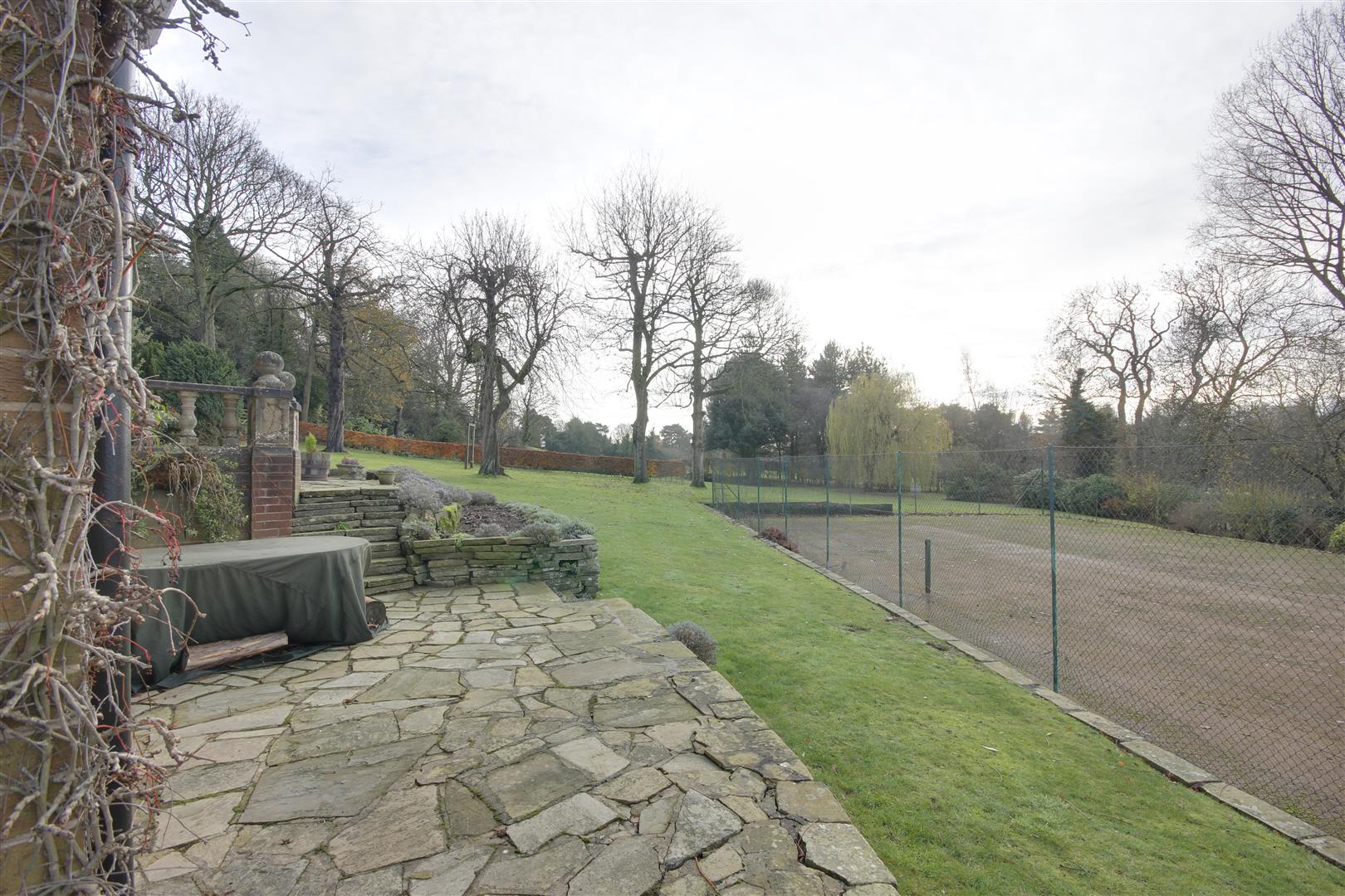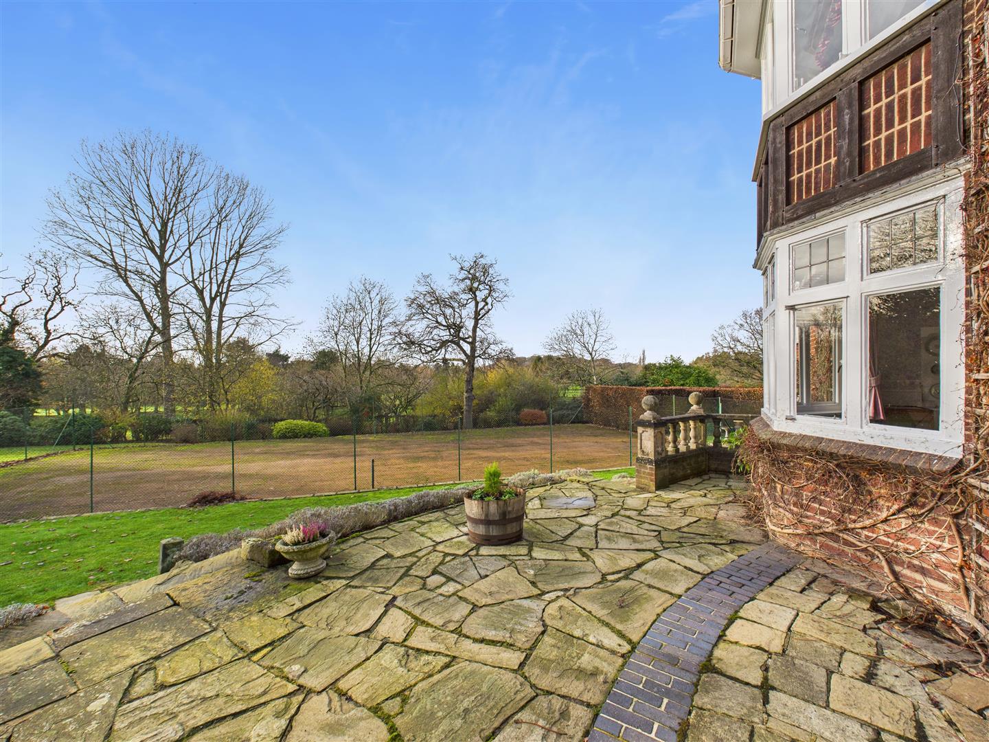 The property has been sited on its plot to take full advantage of the south-west facing aspect with all principle rooms looking into the garden and the golf course beyond. Enjoying an elevated position, this provides some stunning vistas throughout the year. A flag paved terrace runs around the rear of the house beyond which sweeping lawns are bounded by mature shrubbery and planting. Within the garden is situated a hard surfaced tennis court with fenced surround.