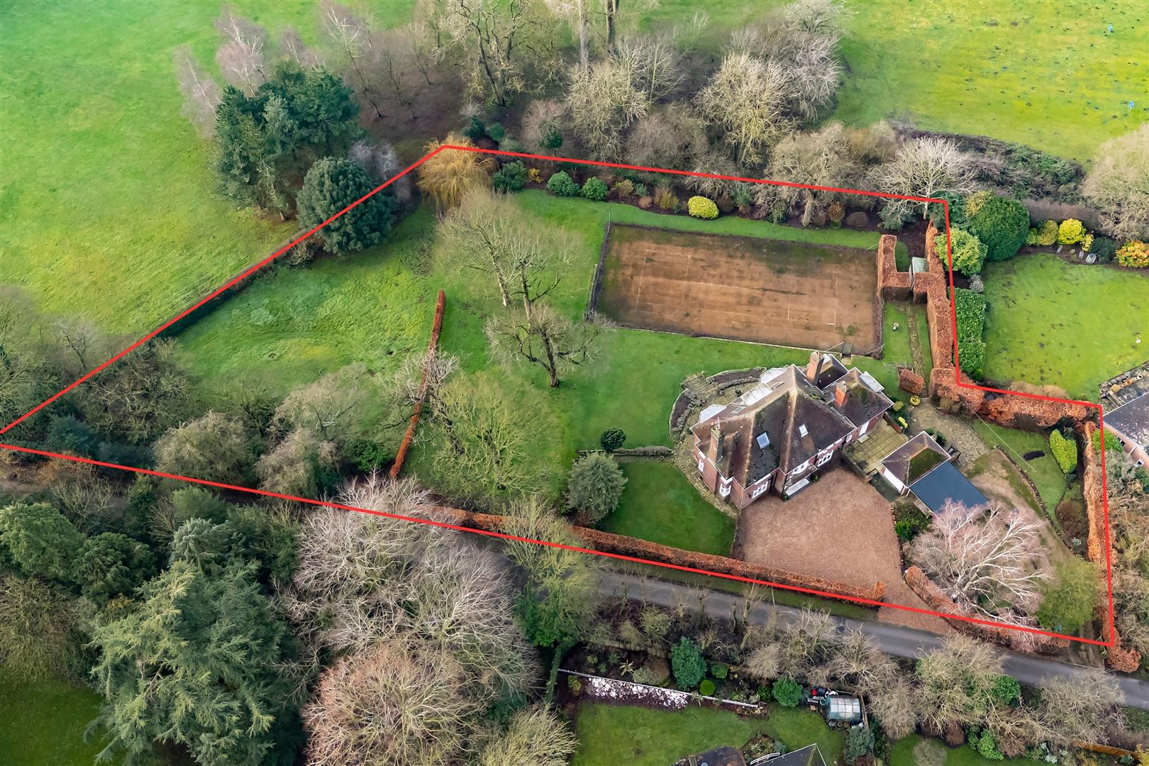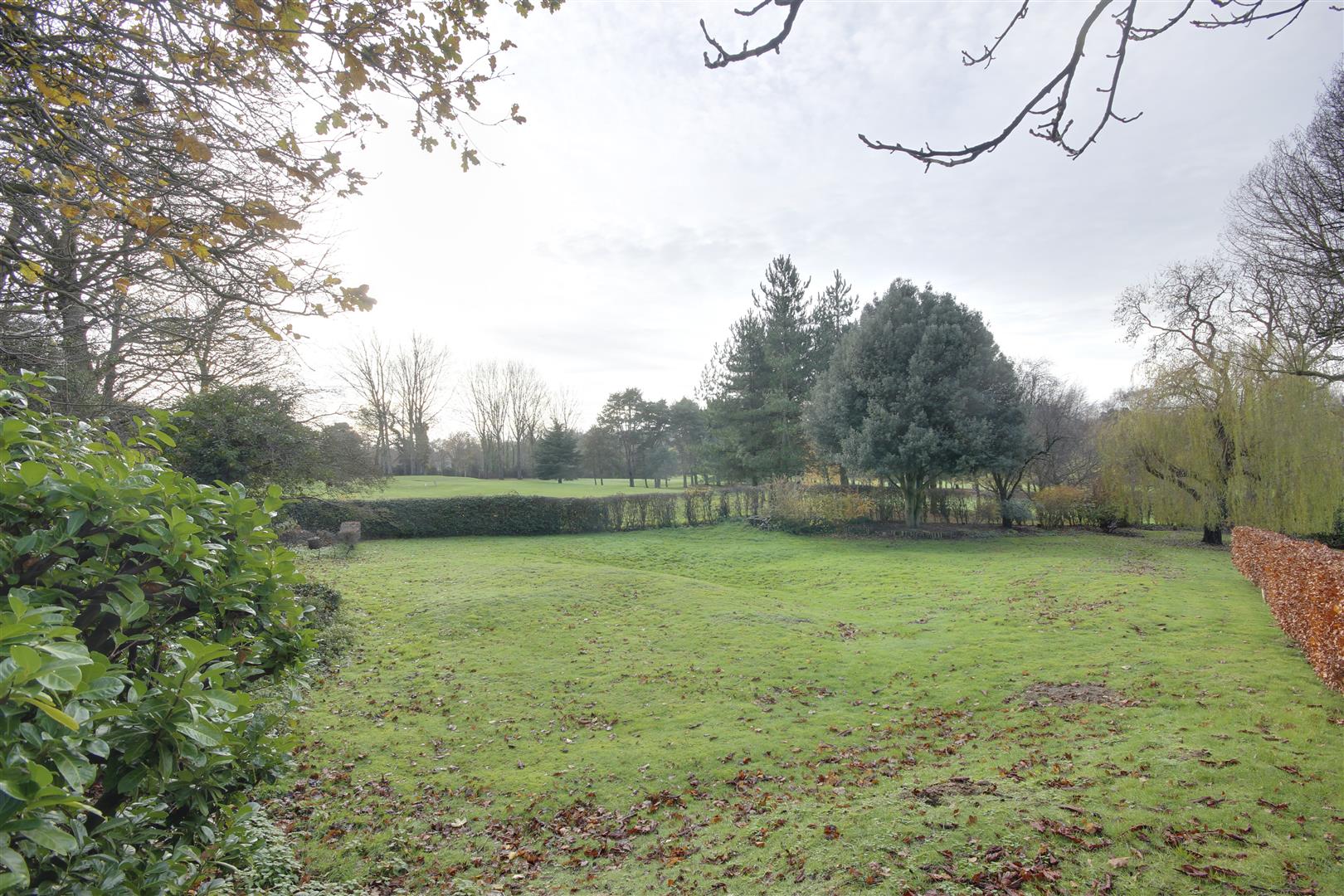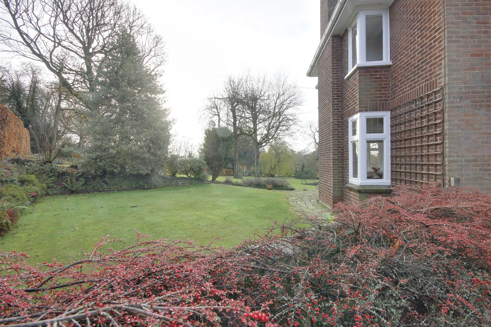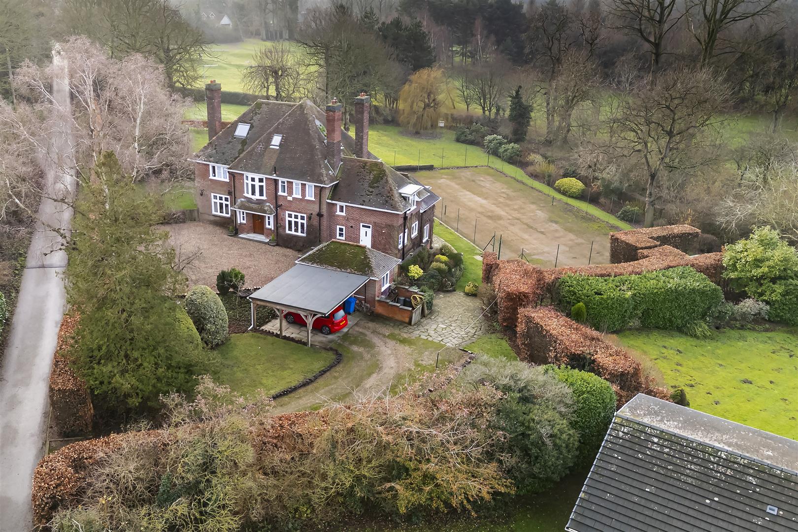 The property has been sited on its plot to take full advantage of the south-west facing aspect with all principle rooms looking into the garden and the golf course beyond. Enjoying an elevated position, this provides some stunning vistas throughout the year. A flag paved terrace runs around the rear of the house beyond which sweeping lawns are bounded by mature shrubbery and planting. Within the garden is situated a hard surfaced tennis court with fenced surround.