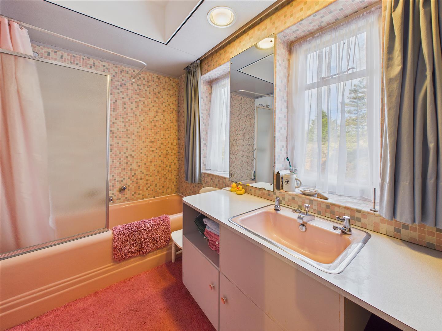 With coloured suite comprising low level W.C., bidet, pedestal wash hand basin, bath with shower attachment and separate shower enclosure, tiling to the walls.